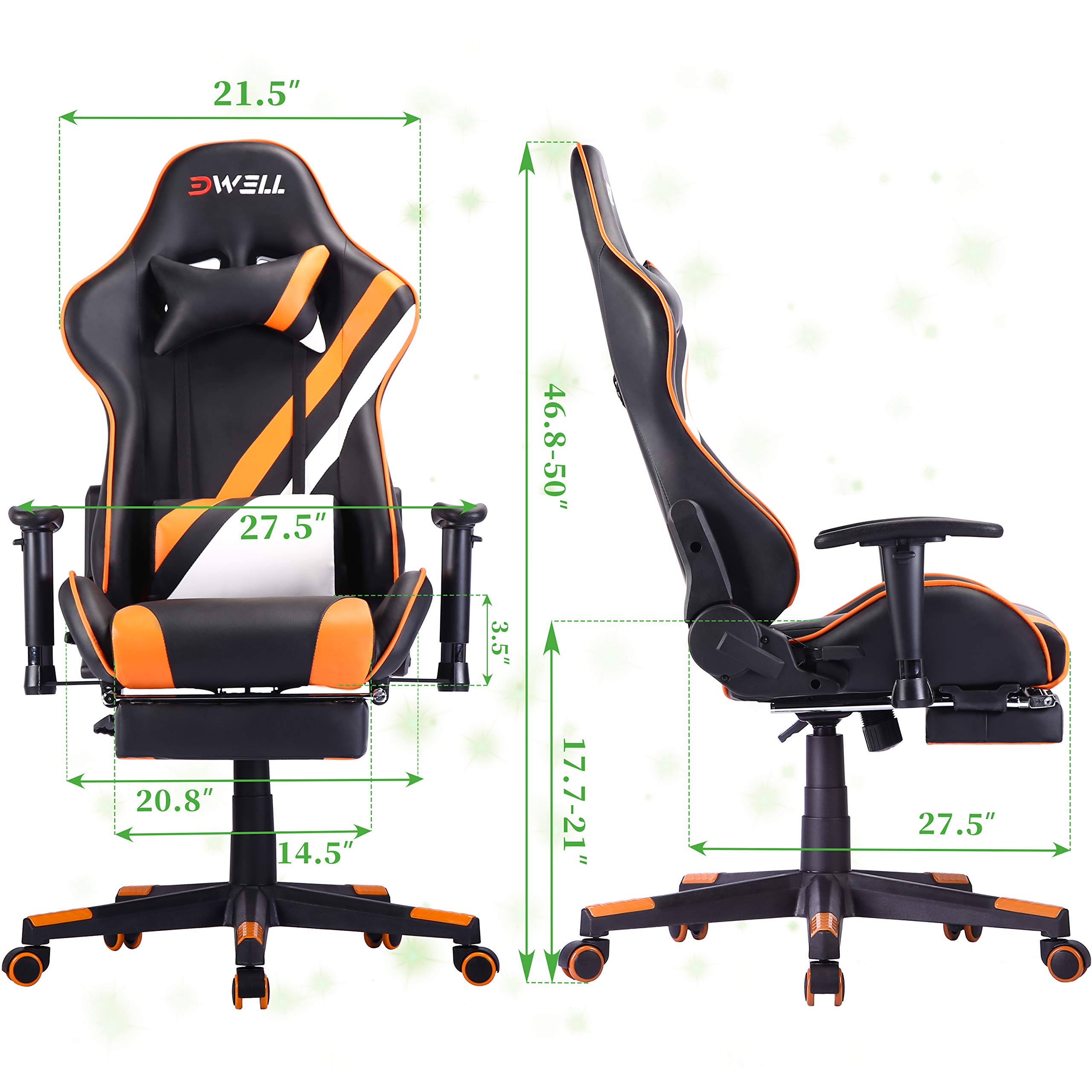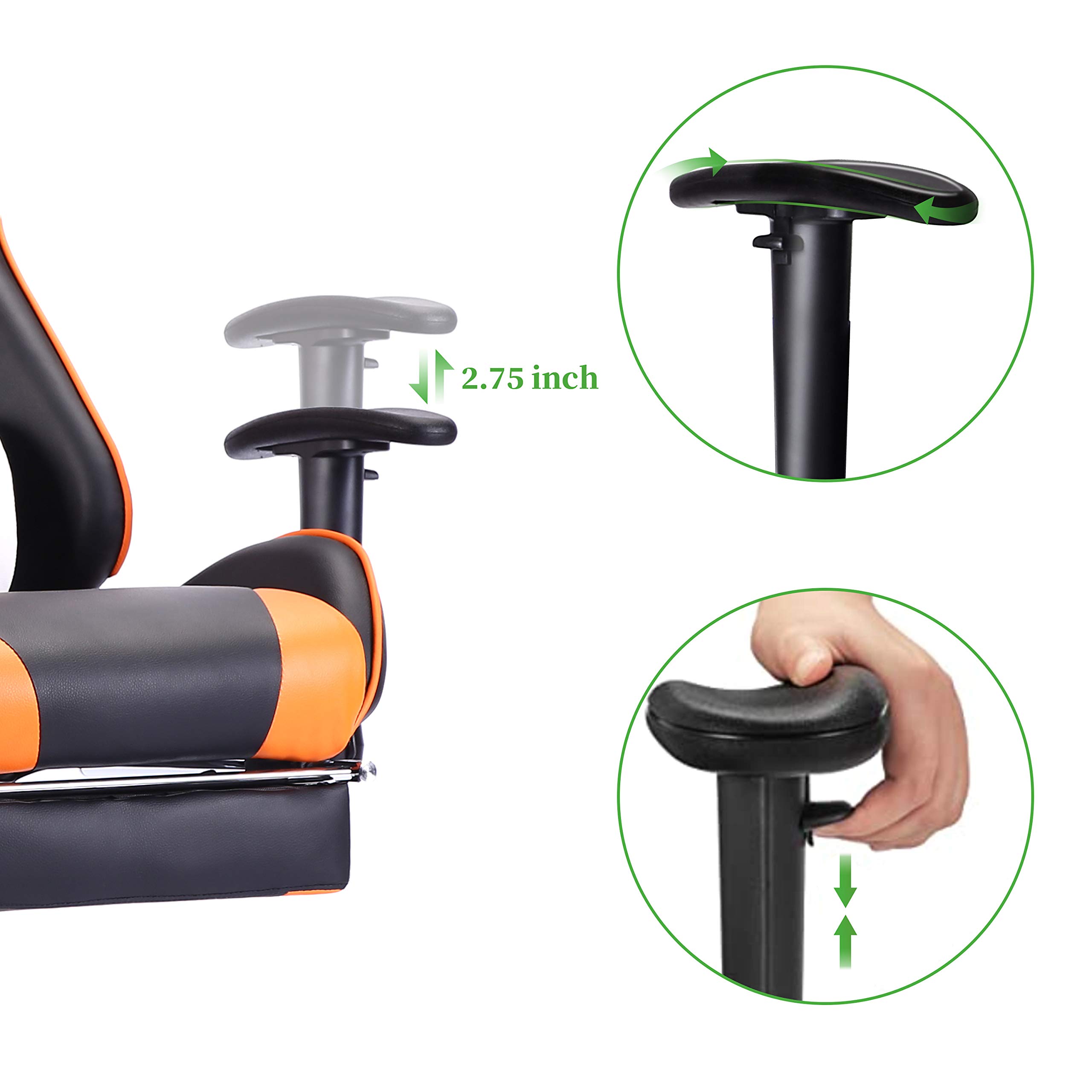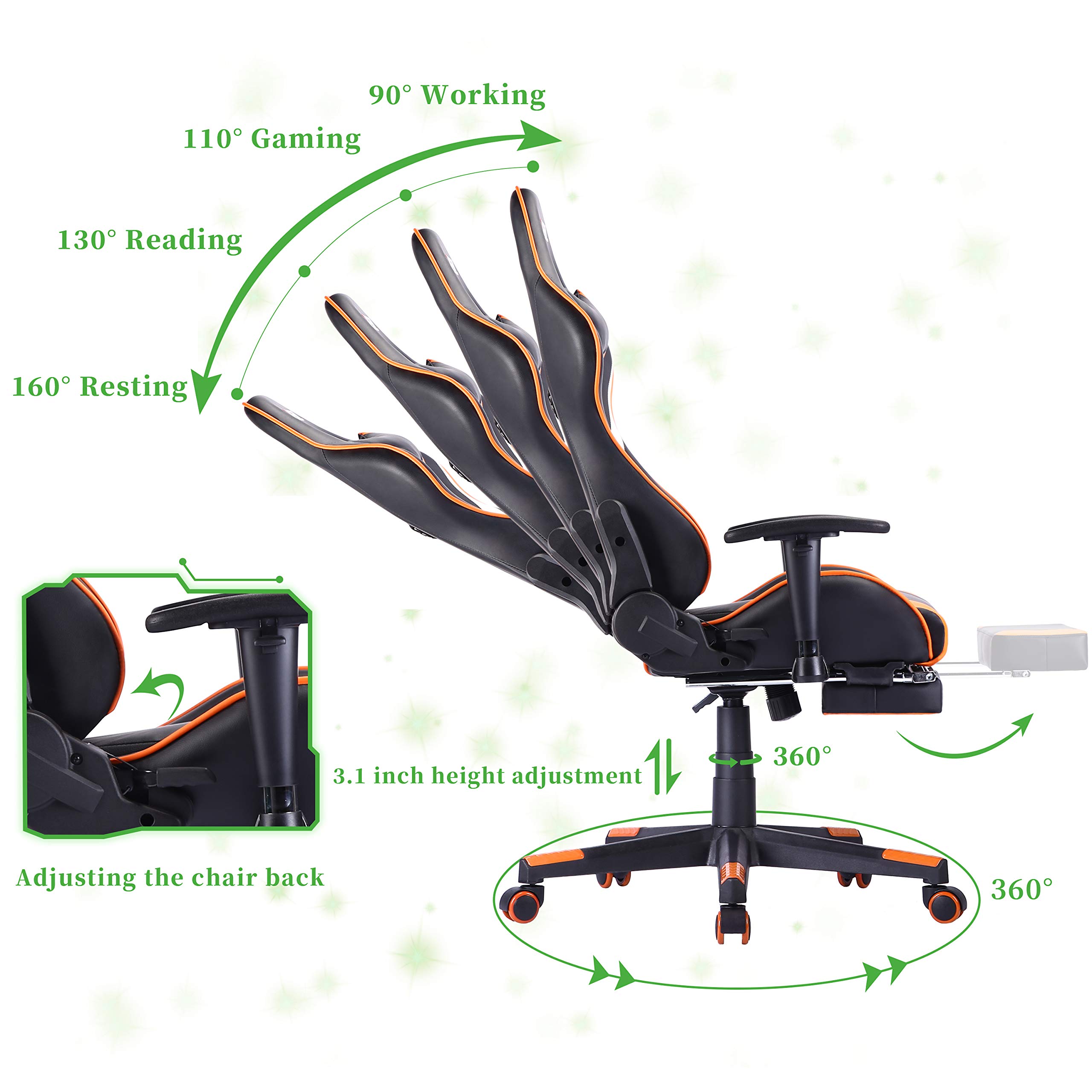 ✔ANSUIT GAMING CHAIR Ansuit is inspired by the three words of safety, comfort and uniqueness.We are committed to creating gaming chair that is both healthy and comfortable. ✔WHY CHOOSE US ? Ansuit ergonomic body-hugging design for natural curvature of a person's back, high quality soft PU high back which can be locked at any angle between 90-155 degree, plus 25 degree rocking function. Height adjustable seat, sideways rotatable and 7 level height adjustable armrest, all for finding your most comfort position while working, gaming, napping or relaxing, no more back pain or fatigue for long time gaming or working! ✔ AFTER SALES SERVICE POLICY We take every gaming chair seriously. Strict inspection has been carried out from product design to factory testing. We hope every customer can get the perfect product, so we will always work hard to make you satisfied. Sincerely thank you for purchasing our gaming chair. Feature: √Larger-size seat cushion, wider chair back √Ergonomic thicker sponge padding, high-quality PU covering. √Ergonomic head, back, lumbar support √Vibratory massage function, effectively relieve lumbar fatigue √360 degree swivel / 90 to 170 degree tilt mechanism √Smoothly height adjustable / Fully adjustable armrests √Heavy duty chair base with castors for greater stability √Maximum Capacity: 300LBS √12 month warranty on parts Size: √Overall Height: 50.0"-53.1" √Seat Area: 14.5"(w)x19.5"(d) Note: Please check the size carefully before purchasing. It is especially important to choose a comfortable chair of the right size. Package included: 1×Gaming chair 1×Headrest cushion & lumbar cushion (USB electric massager contained) 1×Installation instruction 1×Adjustable footrest
