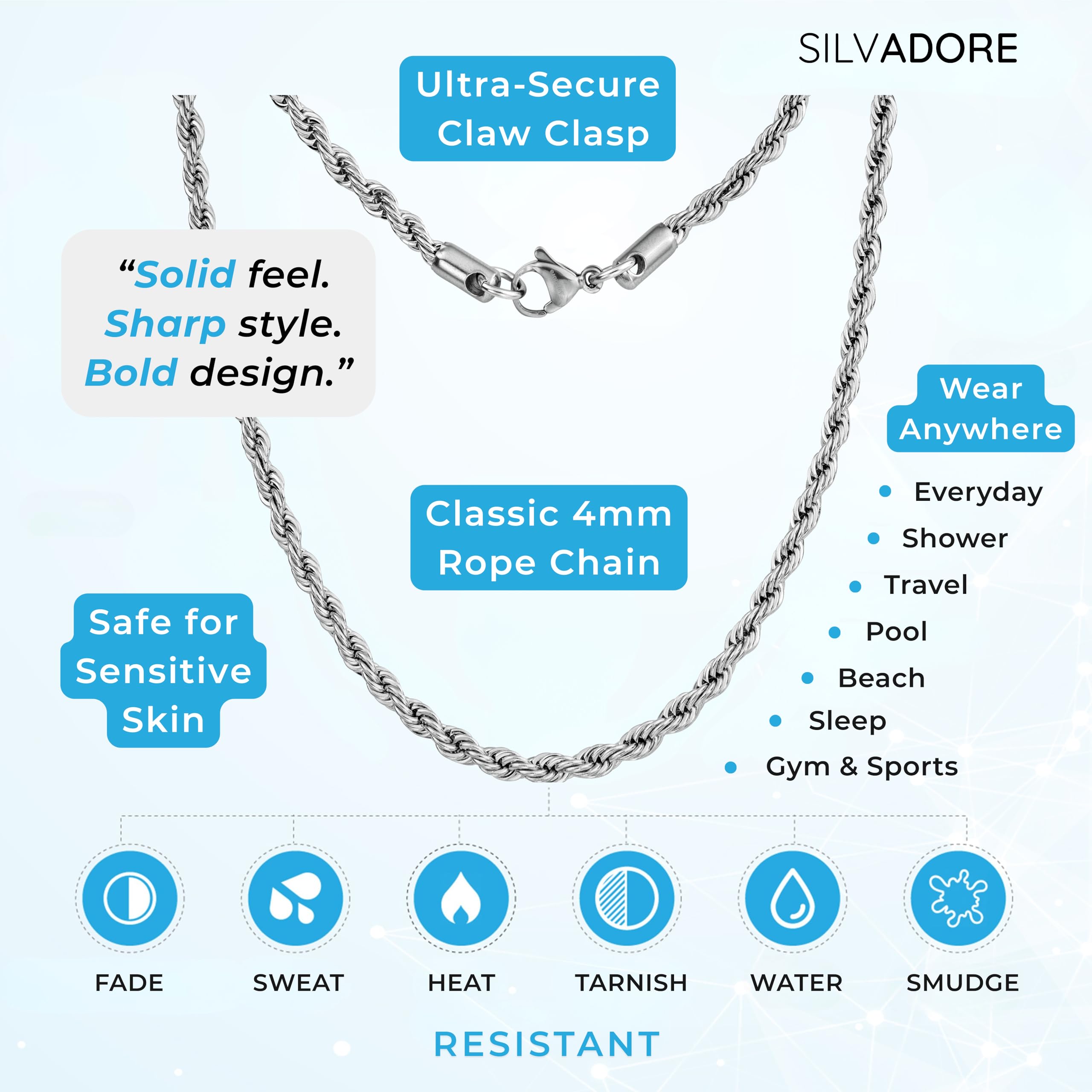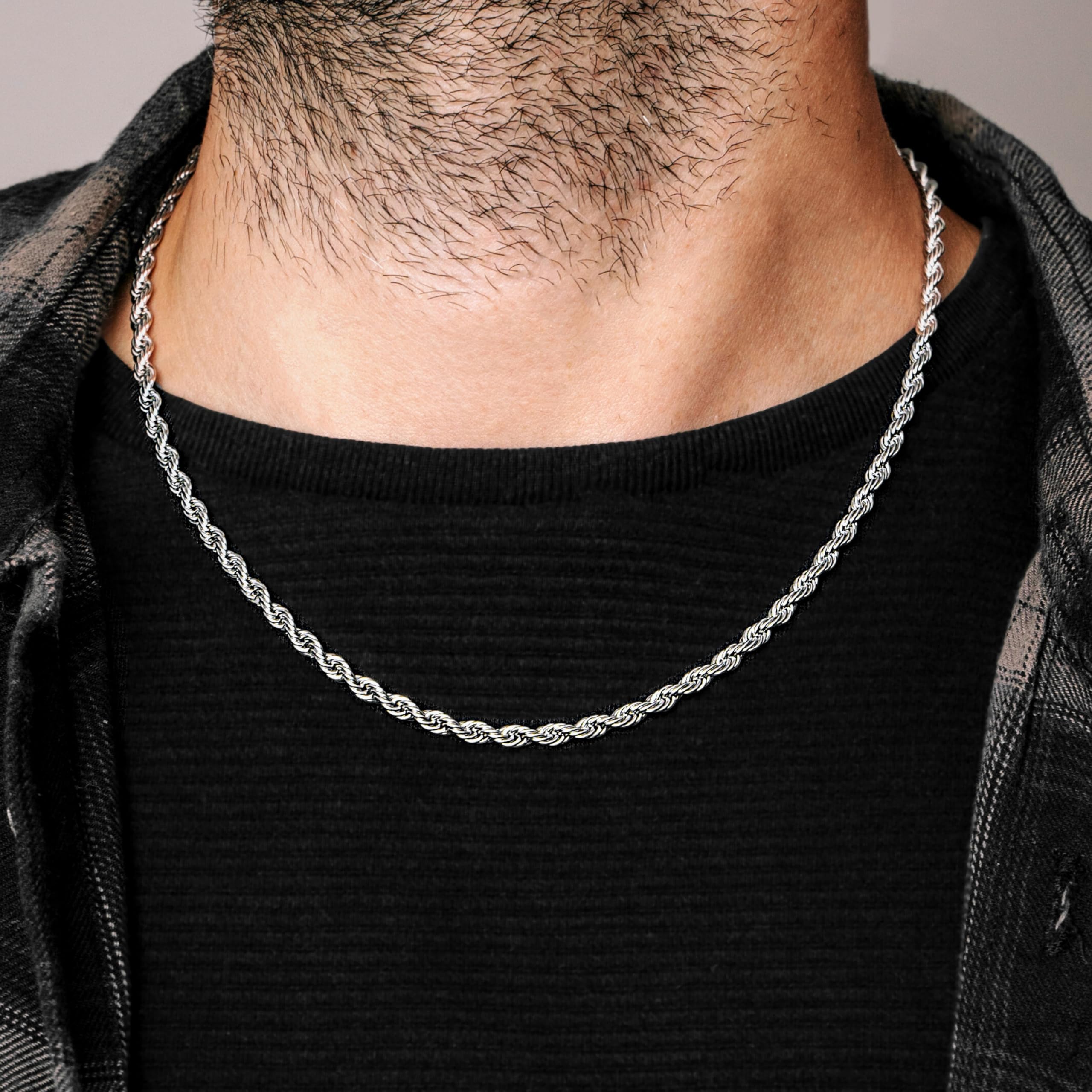 Silvadore Cadena de cuerda de plata para hombre (0.157 in, 24 pulgadas) Collar para hombre chapado en plata de ley de acero inoxidable – Collar de cadena de cuerda de acero inoxidable trenzado cubano – Colgante macizo real que no se deslustra, resistente