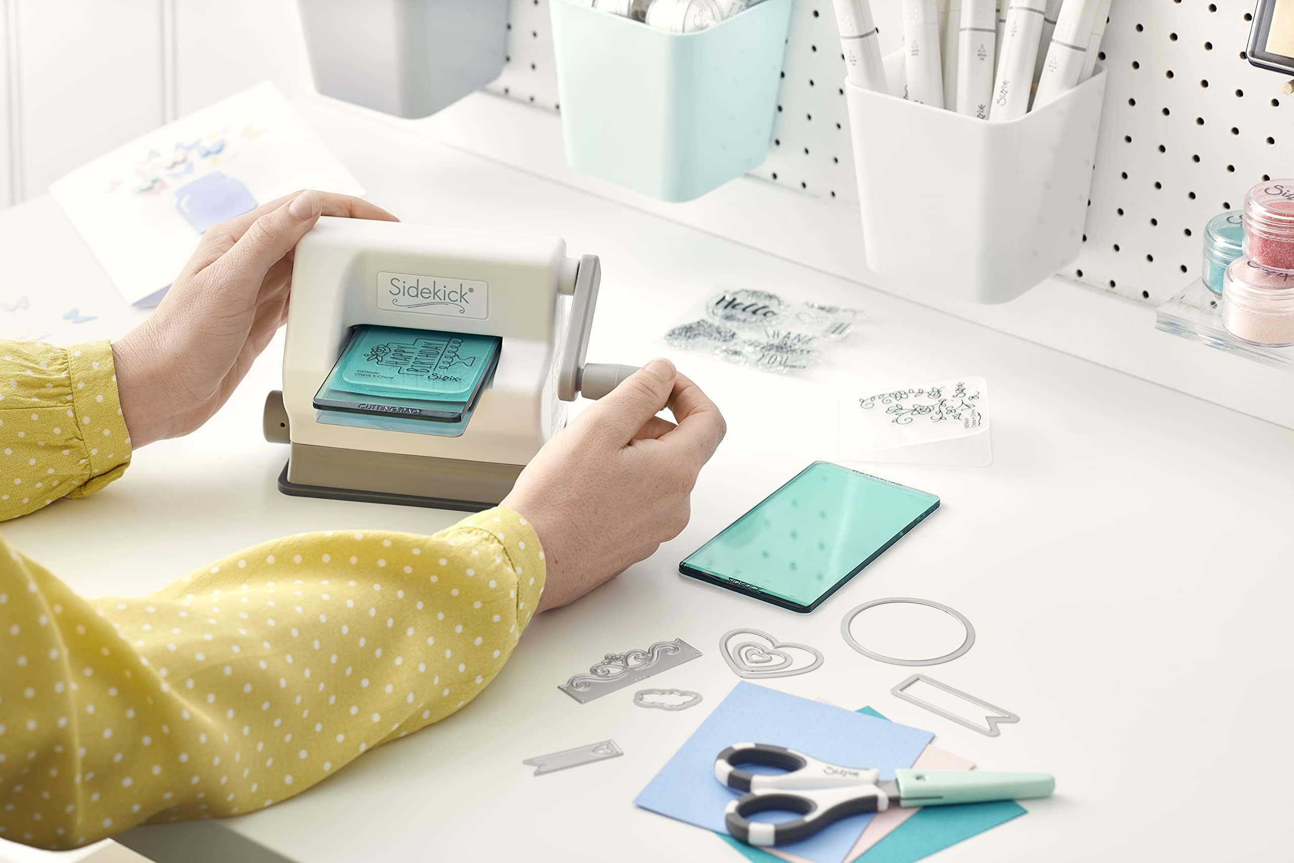 This portable, affordable and adorable crafting system designed for detailed (plastic backed or wafer-thin) dies and embossing folders up to 2.5 inches wide, including Sizzix 12 inch Decorative Strip dies. The Sidekick will cut a single sheet of lightweight to cardstock paper. Aqua cutting pads and embossing pad makes all Sizzix thin dies and embossing folders up to 2.5 inches compatible and works with other brands' dies.This small roller machine weighs 2 pounds, stands 4.75 inches tall and features a three-year limited warranty. This package contains one Sidekick machine, six Framelits dies, two Thinlits dies, two small Textured Impressions embossing folders and seven stamps. WARNING: Choking Hazard, small parts. Imported.