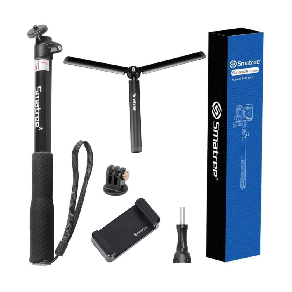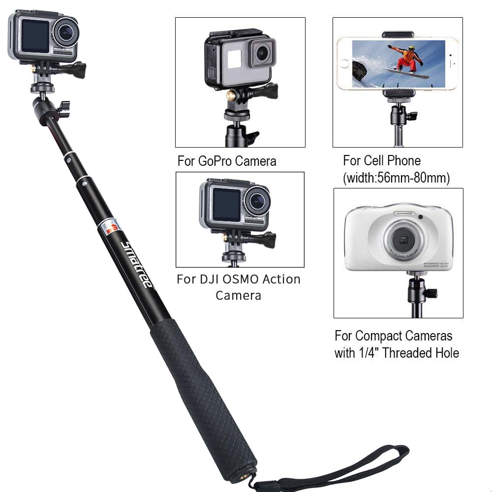 -Flexible ball head of Smatree tripod stand provides 360 degree rotation angle for your camera and cell phone to get different best shooting position. Fits for GoPro Hero 13/12/11/10/9/8/7/6/5/4/3+/3/2/1/Session Cameras /Insta360 X5 /DJI OSMO 5 Pro/4/3/2 /Ricoh Theta S, M15 Cameras/ Compact Cameras(1/4" thread) / Cell Phones(56mm-80mm).