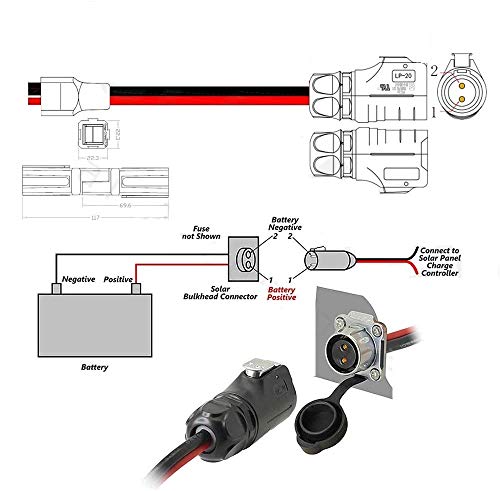 Technical Specifications: 2 Pin Male Power Connector:Rated current 20A, operation voltage 500VAC, outdoor, waterproof IP67. Gold-plated contacts, high strength, corrosion resistance, good electrical conductivity, effective response to Cable Length: 20in/50cm Anderson Adpater Cable to 2 Pin Power Industrial Circular Connector Replacement for SolarSaga 100W Solar Panel ,Fit Forrest River RV Solar Ports,Grand Design RV's Anderson ConnectorEasy to use, plug and play. Color:Black /Red Durability: 500 mating/unmating cycle Temperature rating: -4080 Temperature rise:20A per contact at 30,25A per contact at40, ,30A per contact at 50 Compatibility& Application: Charge Travel Adapter Input Solar Panel , Battery, RV, Trailers, Yachts, Boat Campers Car What's in the Box Anderson Adpater