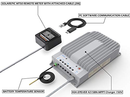 EPEVER MPPT Controlador de carga solar 40A 150V PV Controlador de panel solar Tierra negativa W / MT50 Medidor remoto + Sensor de temperatura Cable de monitoreo de PC [Tracer4215BN]