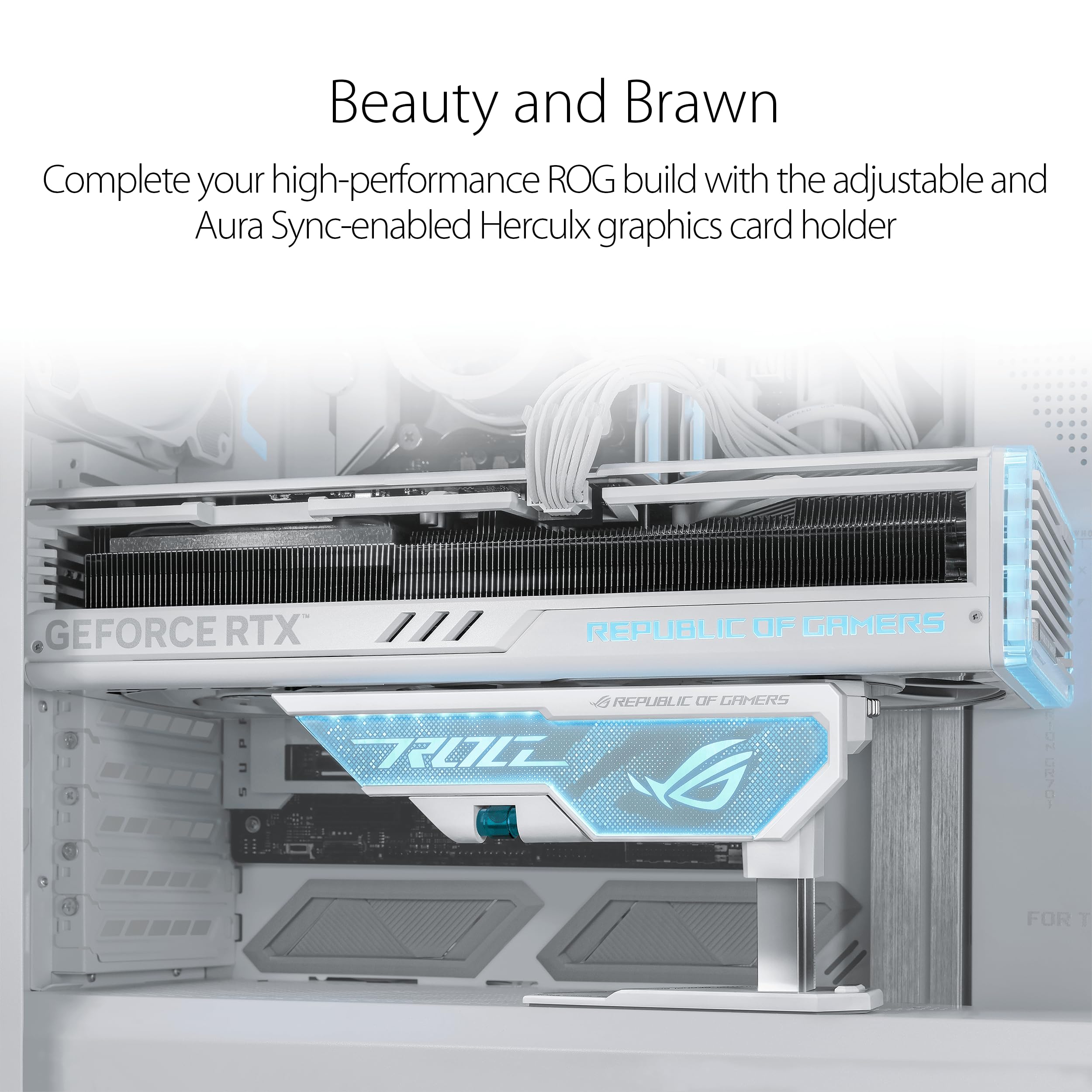 ASUS ROG Herculx Graphics Card Holder White Edition elevates your white PC build to new heights and its stunning new lighting pattern. Matching seamlessly with the latest range of ROG white components, its clean design creates a minimalist aesthetic that is perfect for the understated yet powerful gaming rig of your dreams.
