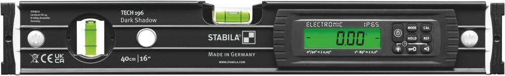 Millions of tradespeople rely on precise and robust TECH spirit levels from STABILA. This limited edition model combines a classy appearance in an anthracite matt coating with high-quality Made in Germany technology. Digital measurements make work easier and save time. Measure inclines and slopes easily and precisely using two digital displays that can be illuminated. Put components in the right position with ease using the acoustic guidance. An indispensable tool that is water and dustproof in accordance with IP 65 and will take your work to the next level.