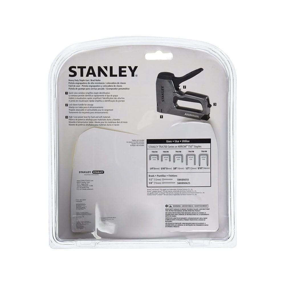 Product Description Stanley hand tools is a brand of hand tools. It is a division of Stanley Black & Decker, following the 2010 merger of the Stanley works with black & Decker. From the Manufacturer Easy-squeeze product works overtime as a staple gun, brad nailer, cable tacker and wire tacker. All-metal drive channel ensures better penetration. Less force to squeeze and more driving power. Heavy duty aircraft-aluminum housing for long-lasting durability. Hi/Lo power lever for hard and soft materials. Flush-nose design solves the problem of stapling in tight spots. Lock-down handle for safe storage. Quick-view window simplifies staple identification. Easy-slide full-stick staple load. Uses Stanley SharpShooter TRA700 series or Arrow T-50 heavy duty narrow crown staples and 1/2-Inch, 9/16-Inch and 5/8-Inch Brads.