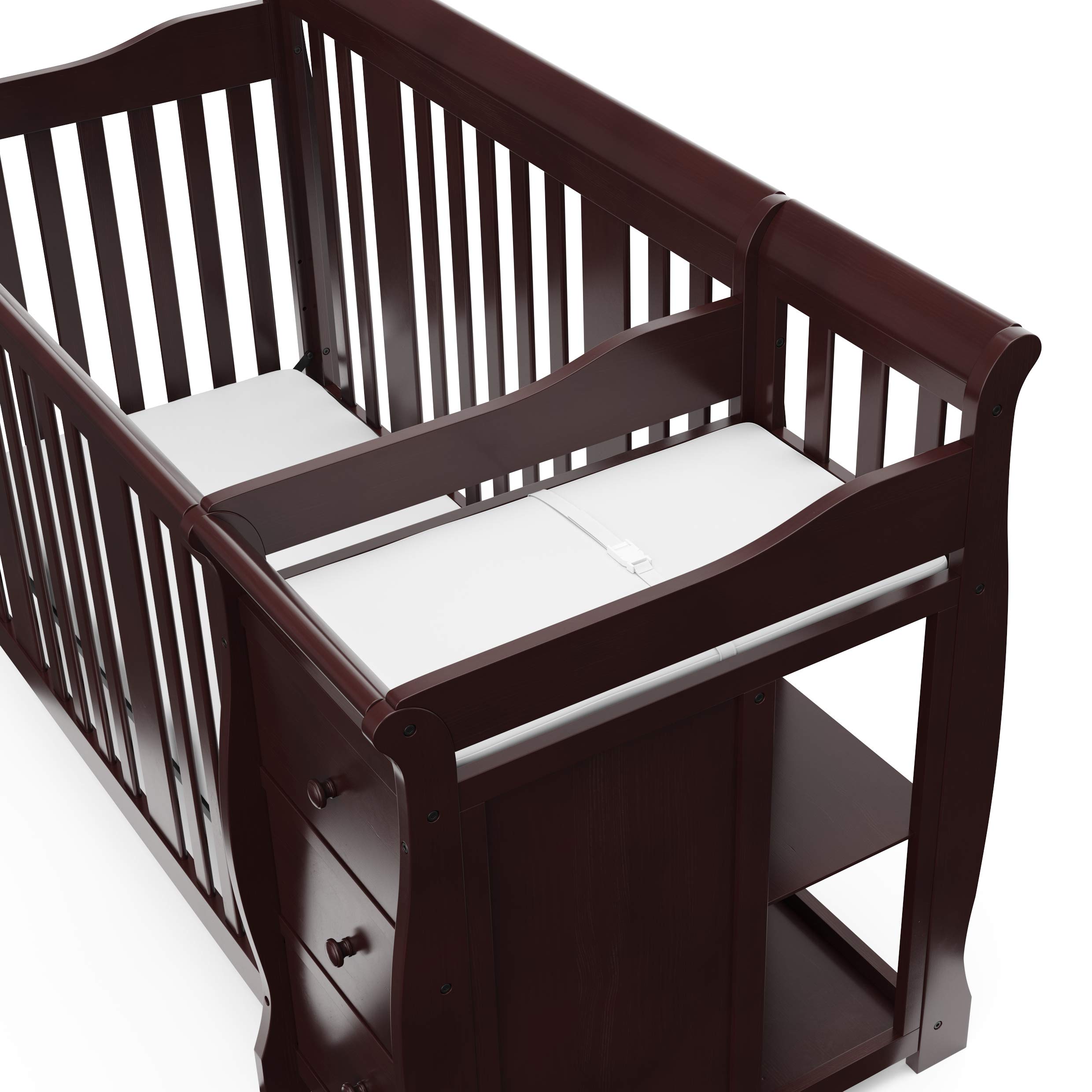Product Description A Storkcraft classic, the Portofino 4-in-1 Convertible Crib and Changer combines unsurpassed quality with style in a versatile package. Offering plenty of storage with its three spacious drawers and three open shelves, this crib and changer converts into a toddler bed (Storkcraft Toddler Guardrail sold separately), daybed and full size bed (Storkcraft Full-Size Crib Conversion Kit – Metal Bed Frame sold separately). For added convenience, the changing table can detach and function as a nightstand when the crib is converted into a full-size bed. Designed with safety in mind and constructed with quality pine wood and composites, the Storkcraft Portofino 4-in-1 Convertible Crib and Changer is available in multiple, safe, non-toxic finishes. The Storkcraft Portofino 4-in-1 Convertible Crib and Changer is certified by the Juvenile Products Manufacturers Association (JPMA) and is stringently tested to meet or exceed all applicable Consumer Products Safety Commission (CPSC) and American Society for Testing and Materials (ASTM) safety standards to ensure the safest sleep environment for your child.Maximum Child Height (Crib Stage) 35 inches ; Recommended Weight Limit (Daybed and Toddler Bed Stage) 50 pounds ; Recommended Weight Limit (Change Table) 30 pounds. Use only a fitted bottom sheet that is specifically designed to fit snugly around a standard size crib and toddler mattress. From the Manufacturer The beautiful solid construction of the Portofino 4-in-1 fixed side convertible crib and changer by Stork Craft, with its magical sleigh design, makes this a royal centerpiece for your nursery. All four sides are stationary and include an adjustable three position mattress support base to add to the security and stability of this versatile crib. It has a well built construction made of solid wood and wood products, offered in a selection of non toxic, durable finishes. It is designed for multiple stages of life; it converts from a full size crib to a toddler bed, to a daybed, to a full-size bed (bed rails not included). The attached changer is designed with safety in mind, with an extra deep surface for added security and stability while changing your baby. Complete your nursery look by adding an assortment of matching accessories, a chest, dresser or glider and ottoman by Stork Craft. Set-up this extravagant piece effortlessly with it's easy to follow directions into a crib that's perfect for your babies' sweet, delicate slumber.