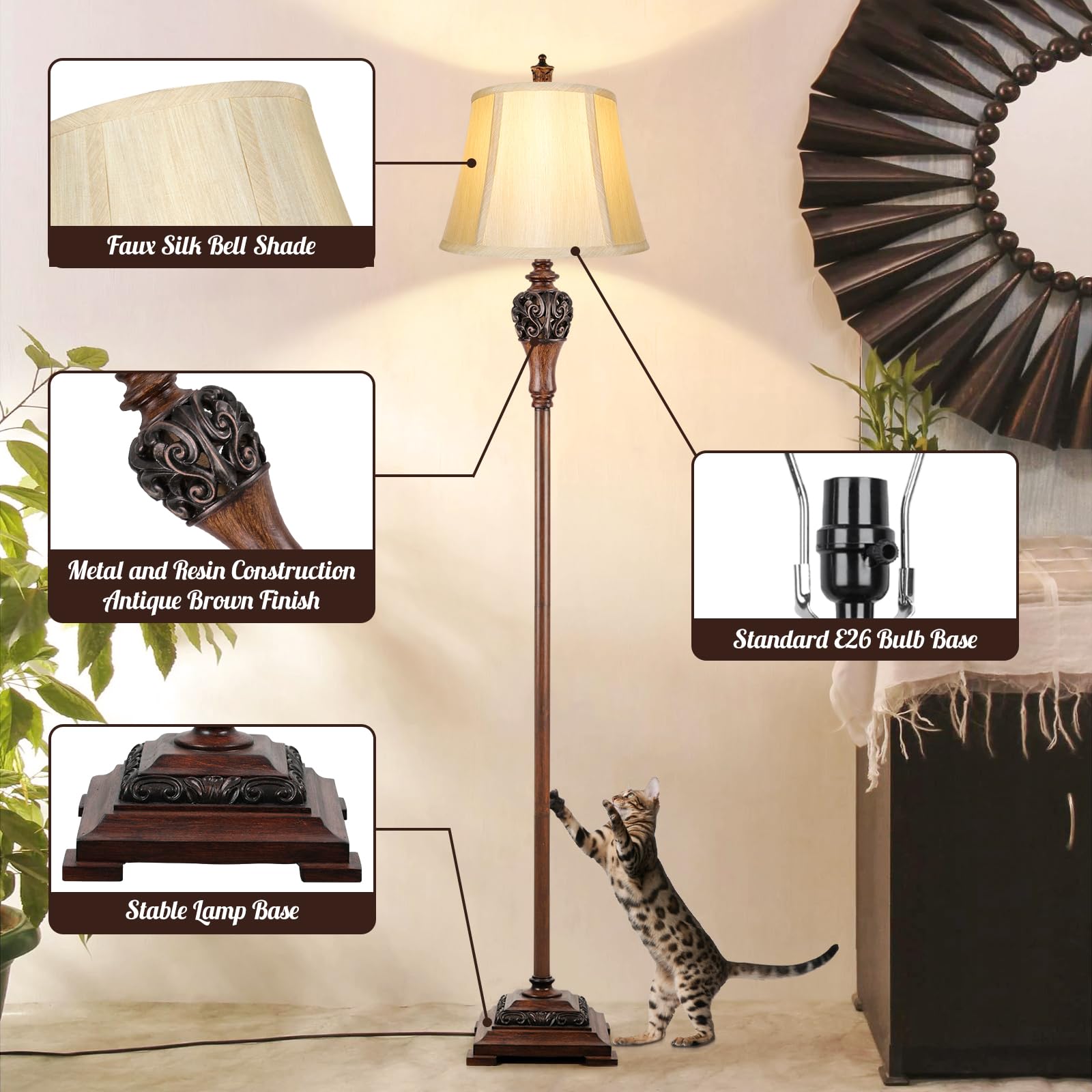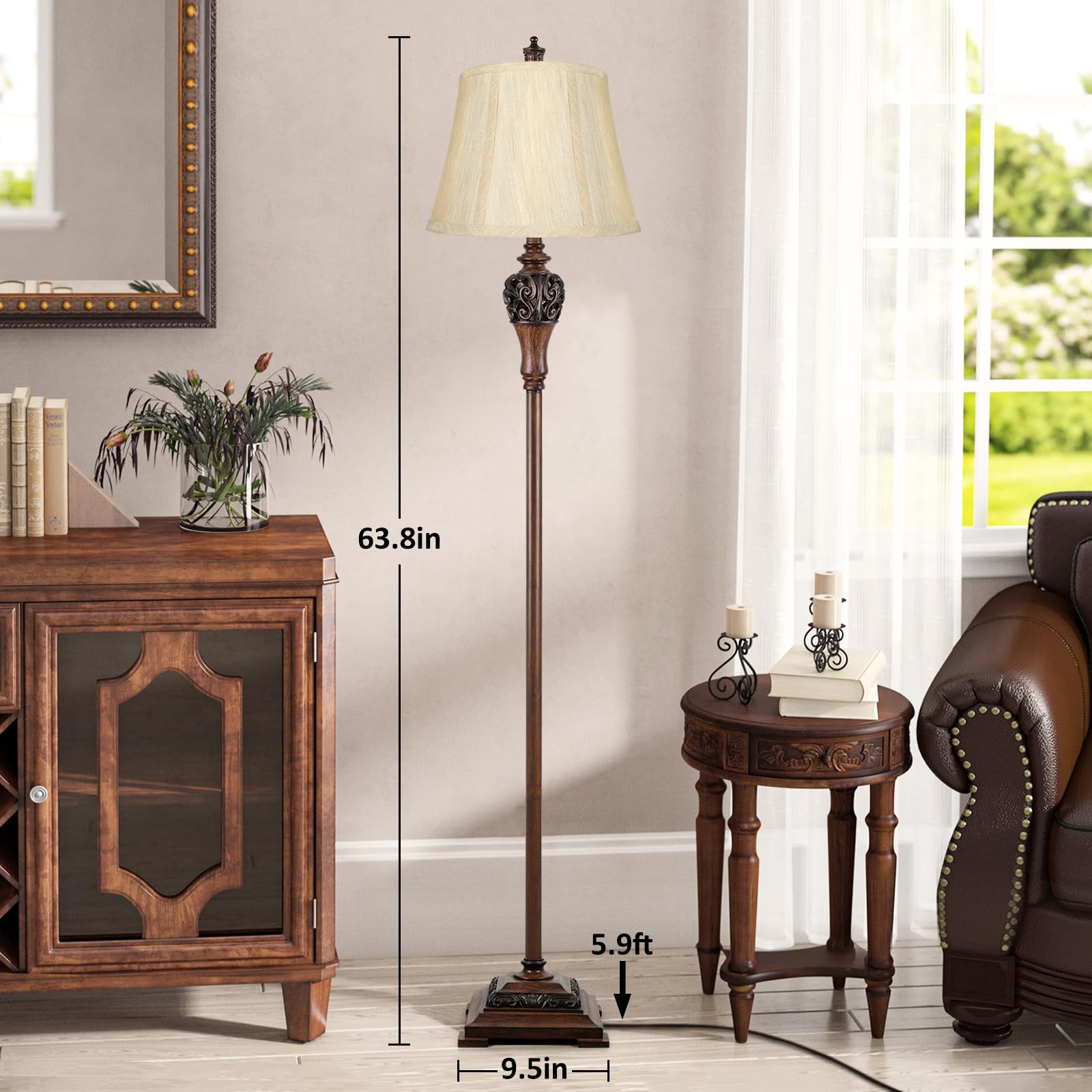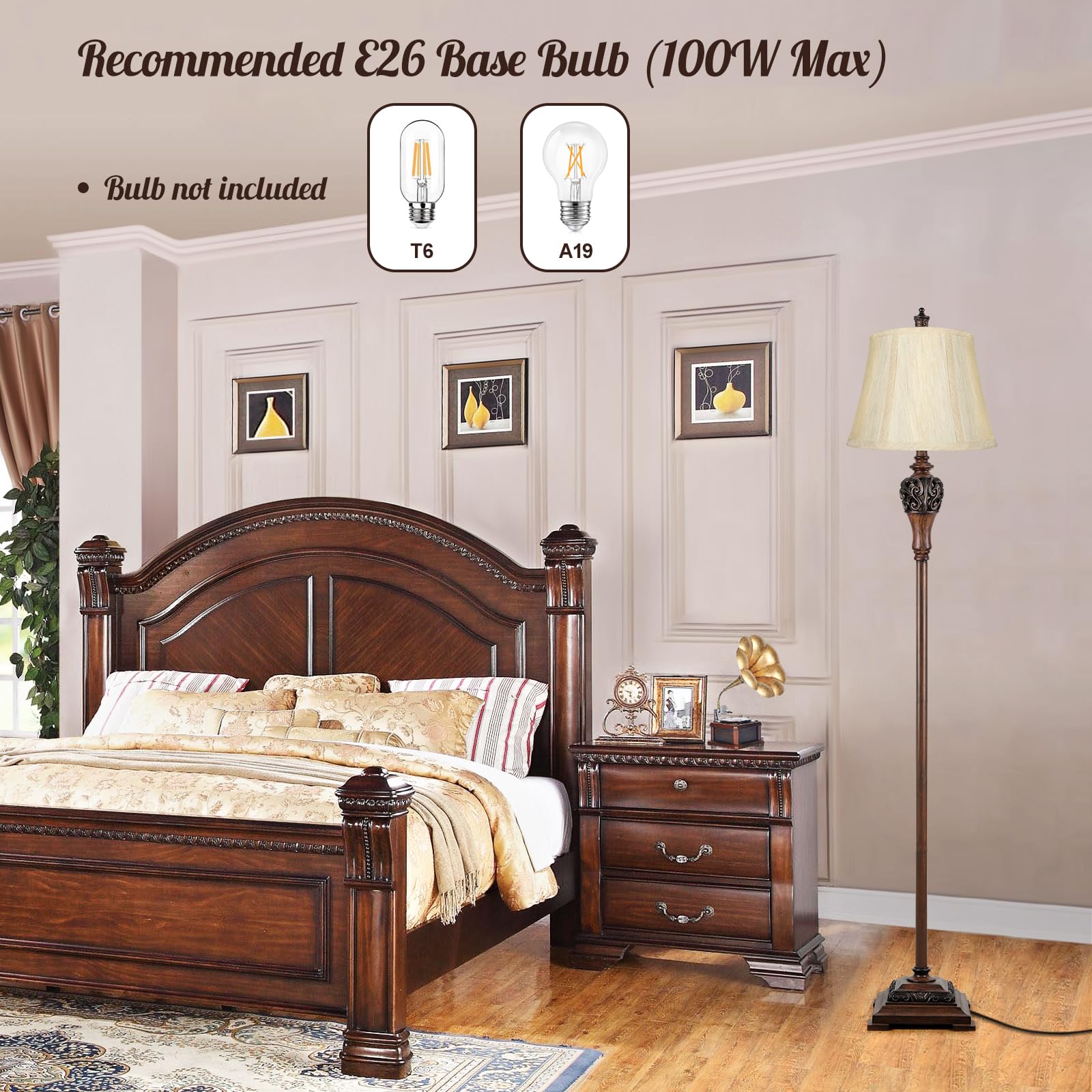 -Vintage Home Decor: This tall standing lamp adorns the upper body with dark brown ornate scroll and accentuates a rustic vibe by sculptured finial while lending a vintage touch with bell shape lampshade. The carved stepped lamp base also enhances the retro style and luxury. These attractive details make this floor lamp an exceptional match for rooms of any styles