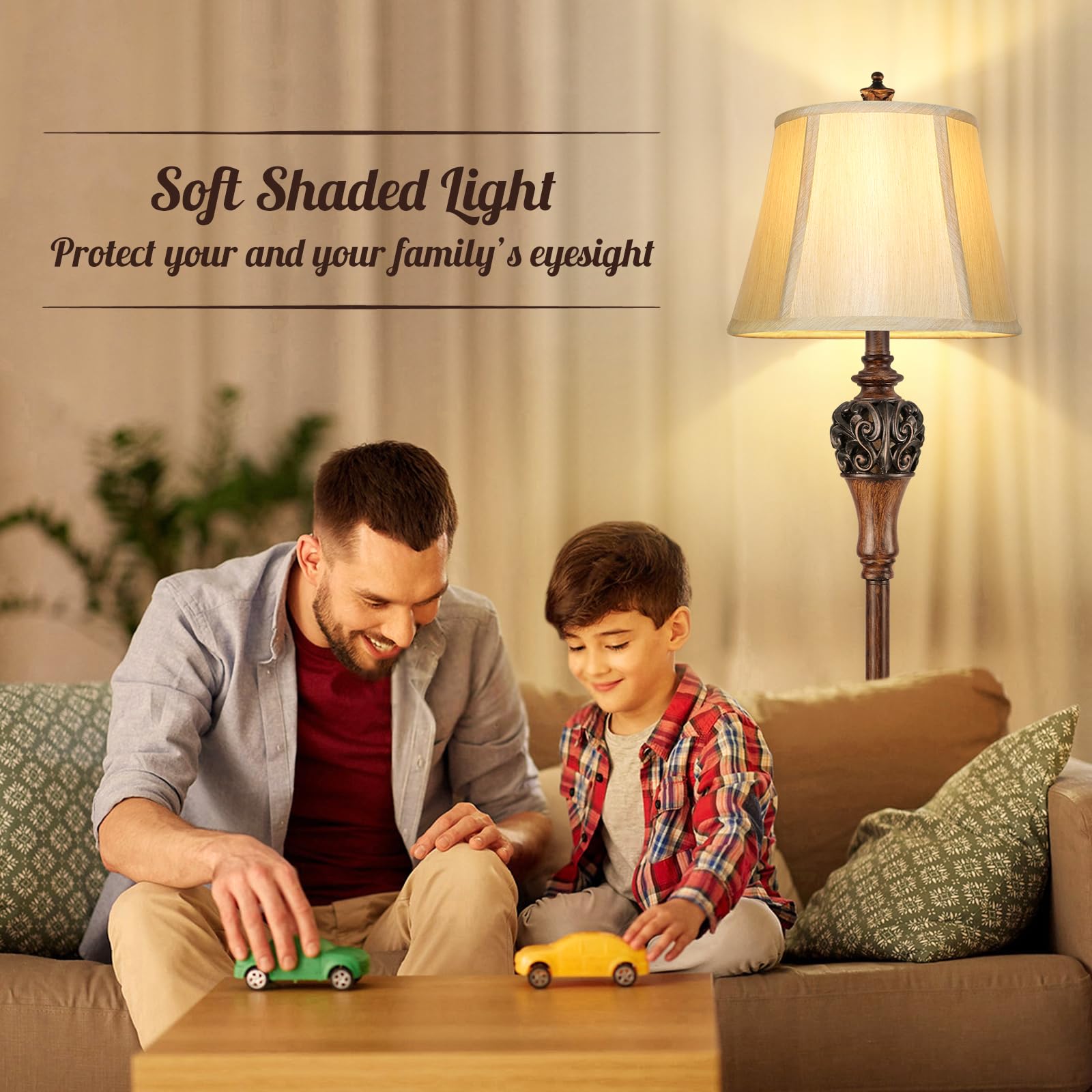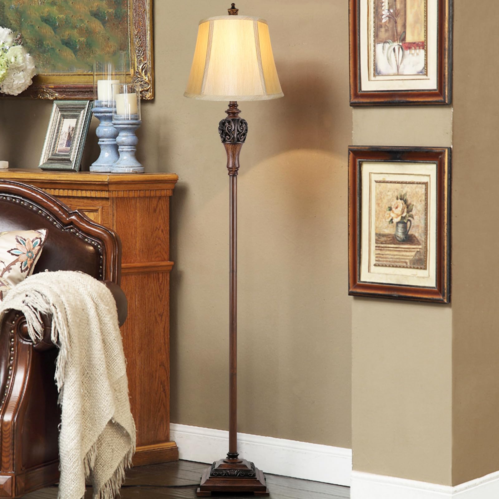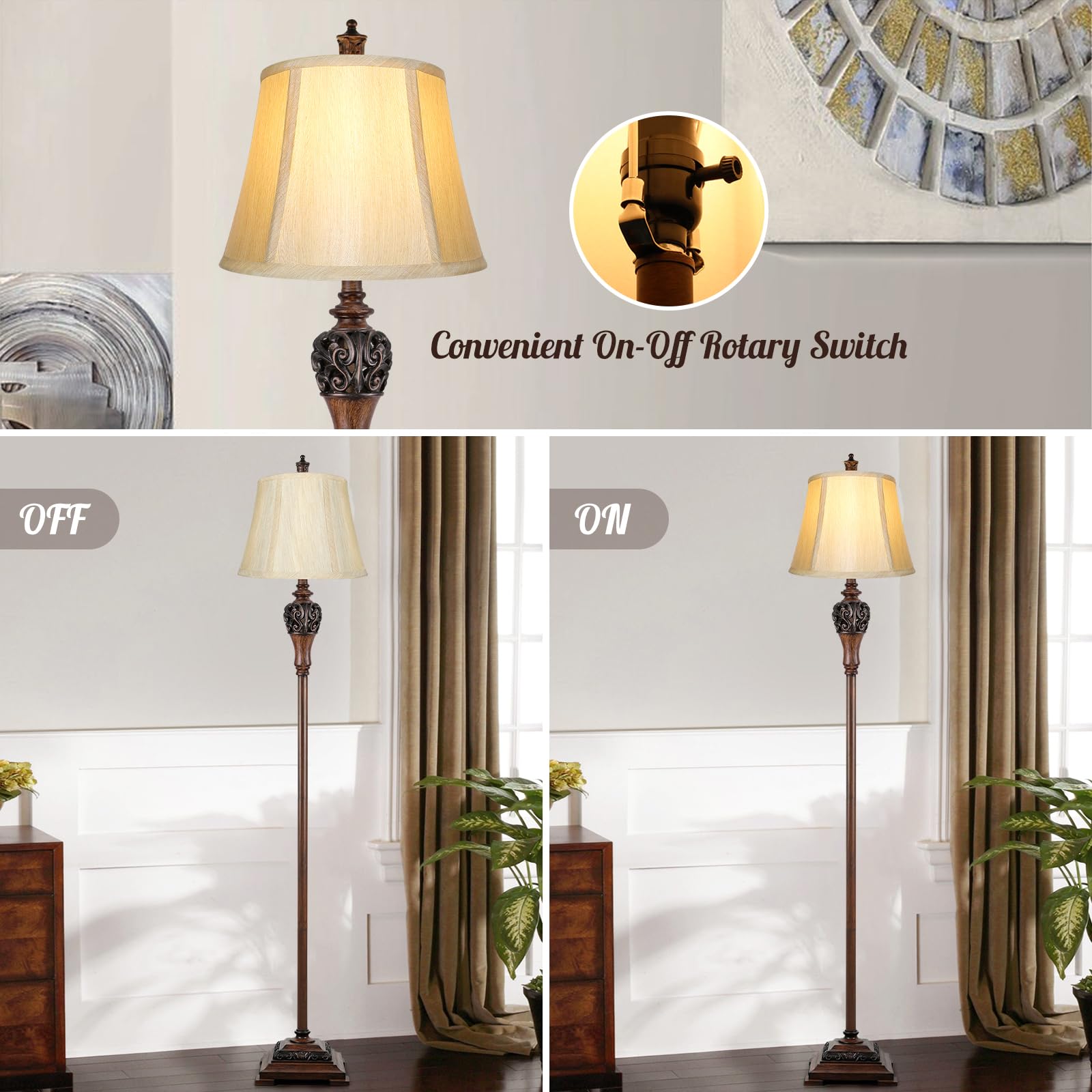 -Vintage Home Decor: This tall standing lamp adorns the upper body with dark brown ornate scroll and accentuates a rustic vibe by sculptured finial while lending a vintage touch with bell shape lampshade. The carved stepped lamp base also enhances the retro style and luxury. These attractive details make this floor lamp an exceptional match for rooms of any styles