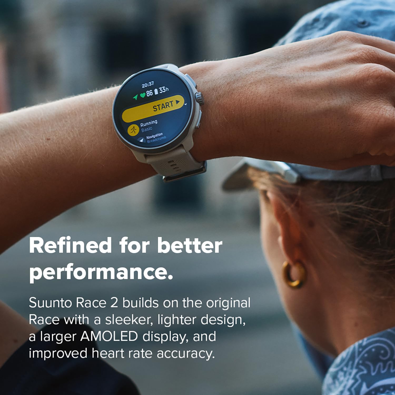 -The watch carries forward what users loved in the original Suunto Race and makes it even better. With a sleeker and lighter design, a larger AMOLED display, and significantly refined heart rate accuracy, Race 2 offers a comfortable, and responsive experience—no matter where or how you train