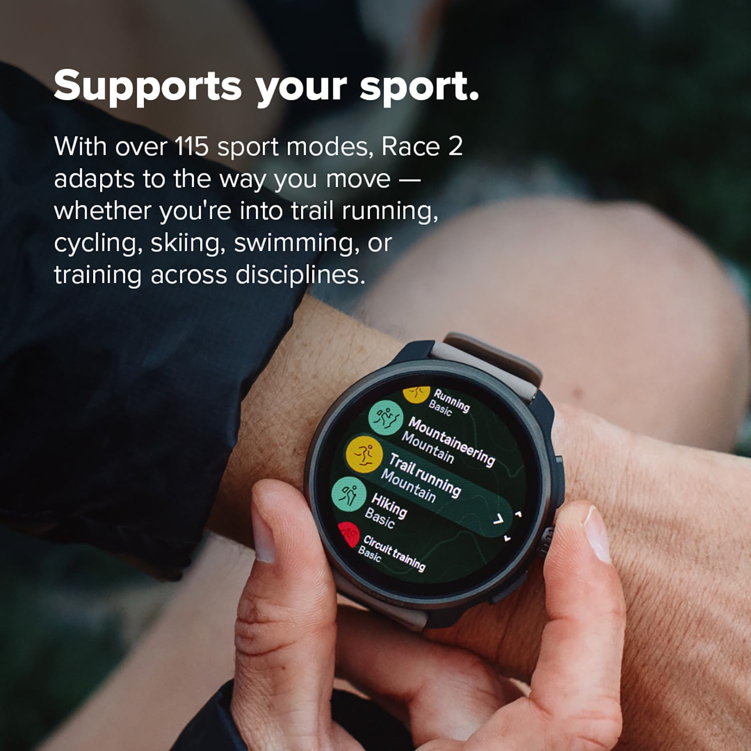 -Race 2 is made to support you through every phase: from structured training to racing, recovery, and everyday life. With over 115 sport modes, it adapts to the way you move—whether you're running trails, cycling, skiing, swimming, or mixing it up