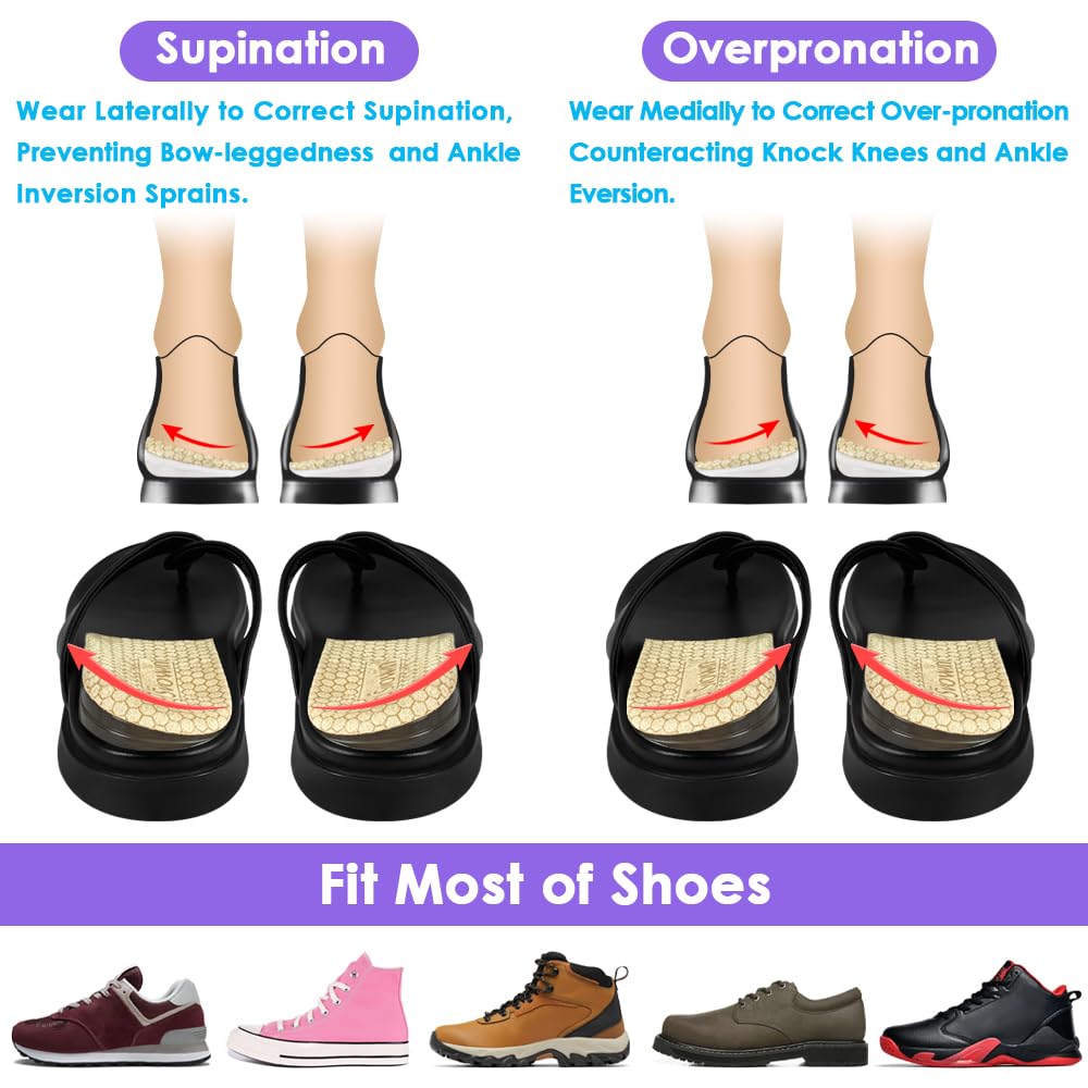 -PACKAGE INCLUDING (You Will Get 1 Pair Beige + 2 Pairs Clear): They are enough side to support your heel and your weight, will not move around down to mid foot. Wear medially to correct over-pronation counteracting knock knees and ankle eversion. Wear laterally to correct supination, preventing bow-leggedness and ankle inversion sprains. Suitable for almost shoes, sandals, boots, leather shoes, flats, sneakers etc.