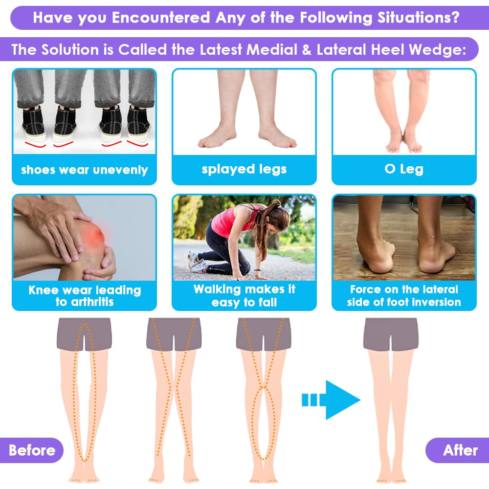 -SOLVE YOUR PROBLEMS:Whether it's osteoarthritis knee pain, easy to fall while walking,shoes wear unevenly, or varus foot (lateral force) or walking in an eight character shape. Our heel wedge Lift insole uses height of tilt difference physical guidance to change daily walking habits and achieve physical correction. perfect for knock knees, pronation (inward roll of foot), and other issues caused by uneven foot alignment, low back pain and also heel, hip, neck, and jaw pain. Use all day while standing, walking, the medial & lateral heel wedge will give you the protection you need.