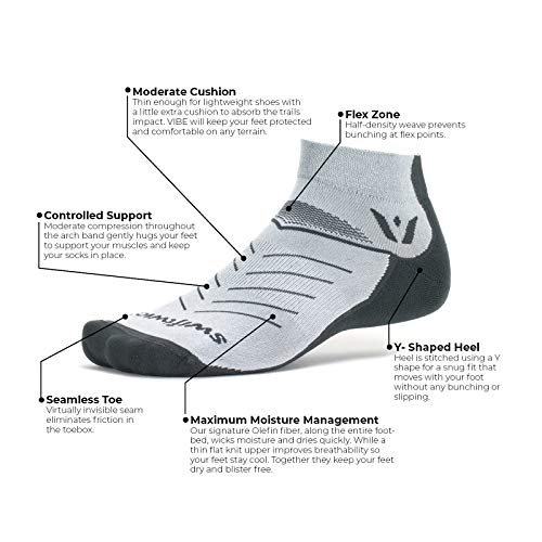 - MAXIMUM SWEAT AND MOISTURE MANAGEMENT - Our signature Olefin fiber, along the entire footbed, wicks moisture and dries quickly. While a thin flat knit upper improves breathability so your feet stay cool. Together they keep your feet dry and blister free. - CONTROLLED SUPPORT - Moderate compression throughout the arch band gently hugs your feet to support your muscles and keep your socks in place. - MODERATE CUSHION - Thin enough for lightweight shoes with a little extra cushion to absorb the trails impact, VIBE will keep your feet protected and comfortable on any terrain. - SEAMLESS TOE - Virtually invisible toe seam eliminates frition on the toes and keeps you blister free. - MADE IN THE USA - Swiftwick Socks are designed and crafted in the USA