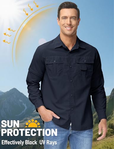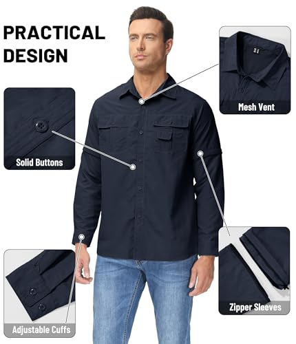 -Convertible Zipper Sleeve Shirt&Function Pocket Design:This hiking shirt for men is equipped with multiple practical pockets,offering ample storage.The long sleeve shirts ferturing with zippers can convert long sleeves to short sleeves for hot days.