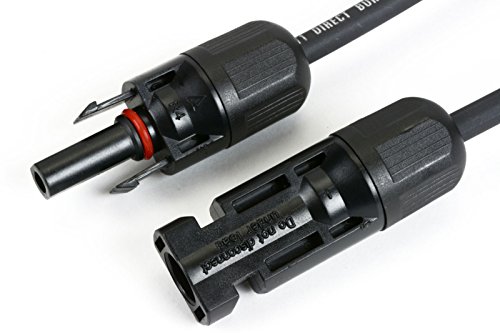 Size:10 AWG Solar Cable-|-Color:100 Feet Black + 100 Feet Red2 lengths of 100 ft. each. UL 4703 rated cable is superior to USE-2 in regards to low temperature flexibility, sunlight resistance, and flame resistance. PV wire for solar panels also has a thicker jacket and insulation than USE-2 wire. USE-2 cable is used in grounded PV systems only, which UL 4703 cable can be used for both grounded and ungrounded arrays. Silver-plated Copper Terminals outlast and outperform tin-plated models. Used for Solar panels, DC circuits, and inverter wiring. Connectors rated for 1000V, 25A - 14 AWG (2.5mm), 30A - 12 and 10 AWG (4mm,6mm) Test voltage: 6 kV (50 Hz) PC/PA Insulation Rated for -40C ~ 85C IP67 Protection Grade, Safety class II, Flame class UL94-V0 Contact resistance Less than or equal to 5 mOhm Insertion force: Less than or equal to 50N Withdrawl force: Greater than or equal to 50N Snap-in locking system Bare copper conductor Cross linked Polyethylene (XLP) insulation Max. voltage 600 V, -40C to 90C Type USE-2 per UL 854, RHH/RHW-2 per UL 44, Type PV per UL 4703