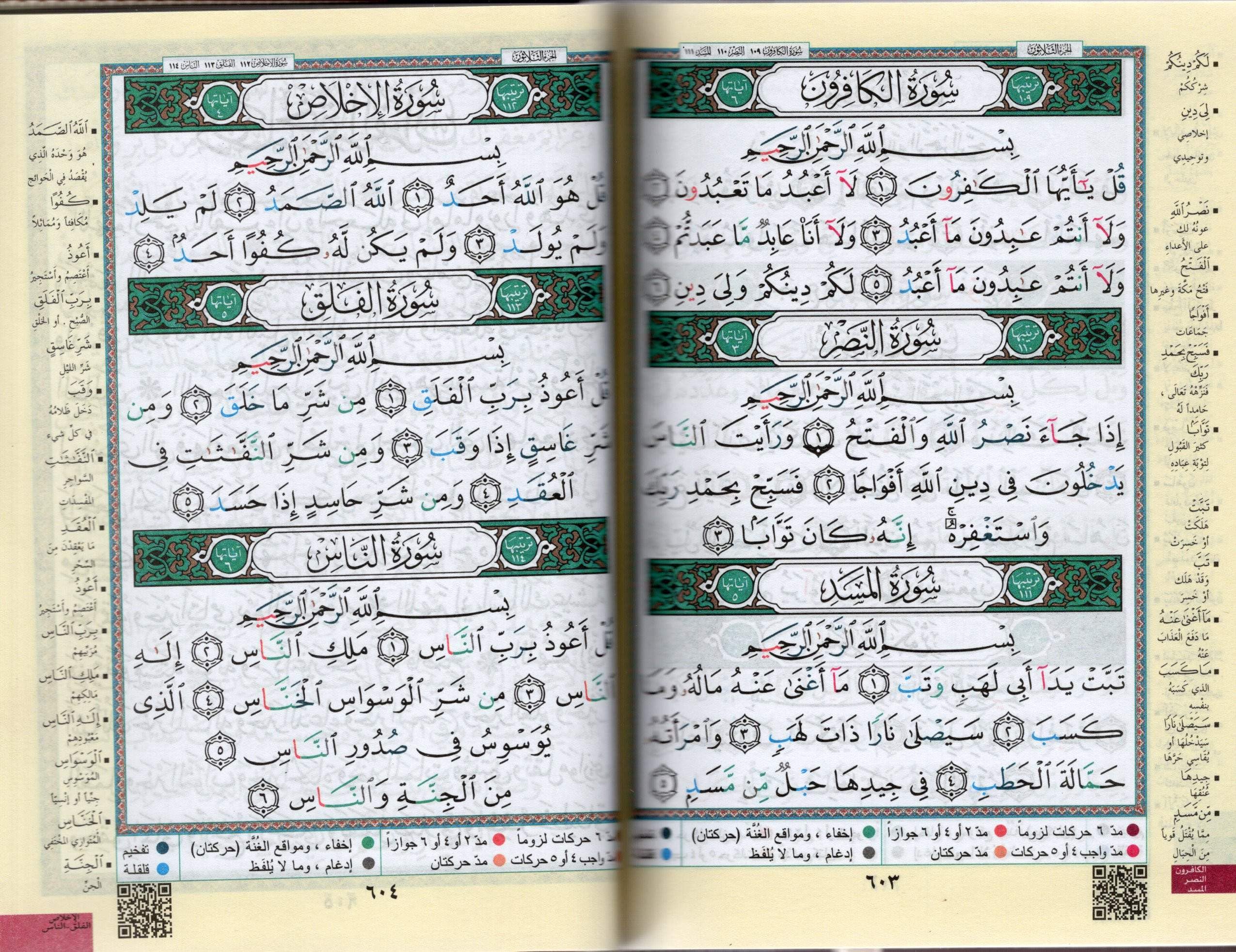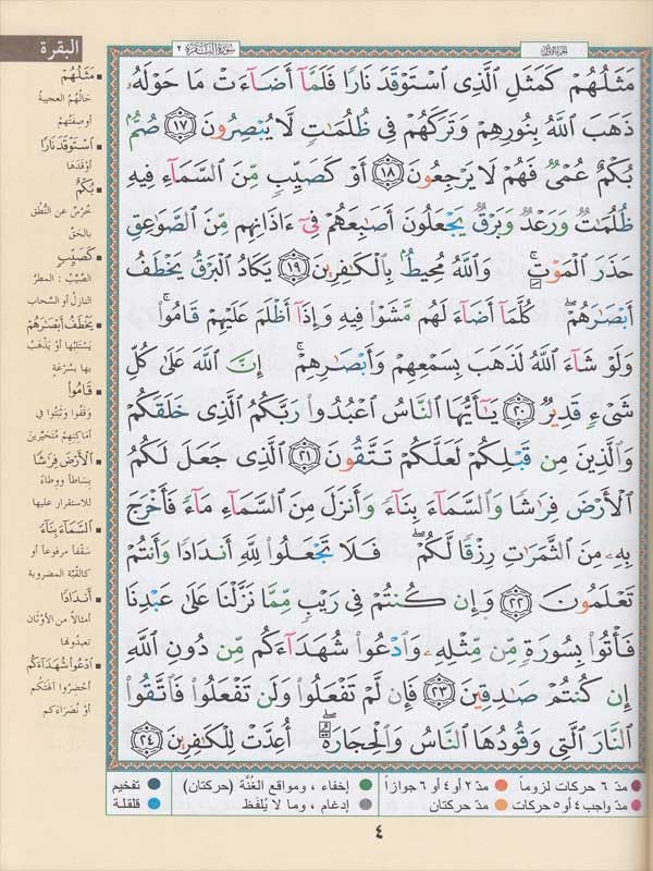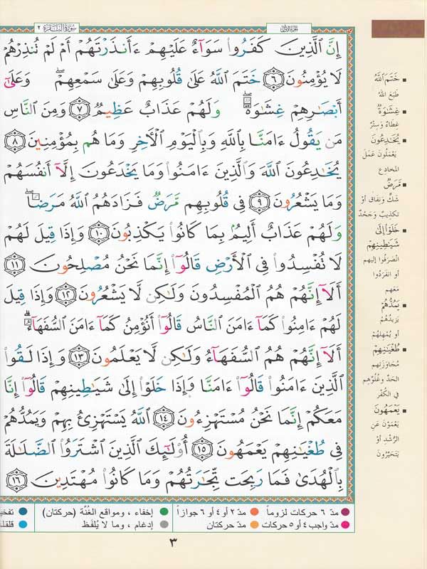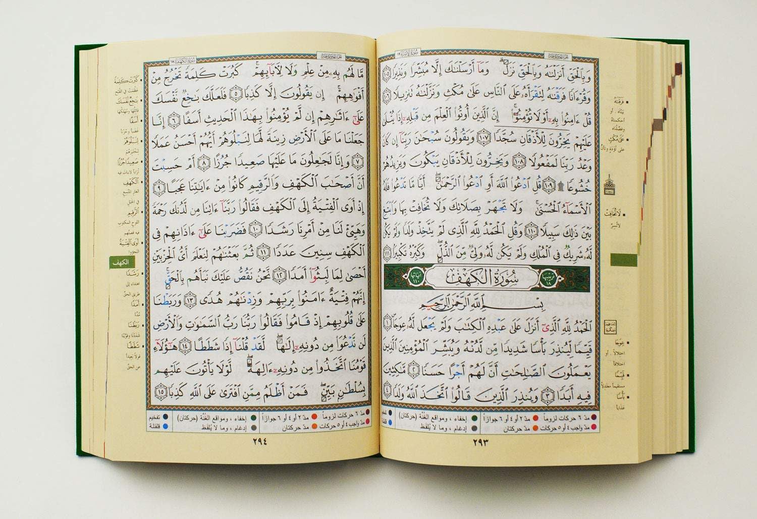The publishers have designed the text to show the rules of tajweed when reading the Qur'an. The text is written in Uthmani style and has case vowelization and dotting on the letters that are audible. Letters related to tajweed rules are distinguished within the text by the use of colors, indicating the various tajweed rules. This technique helps simplify the rules of recitation for the reader in order to encourage and facilitate correct Qur’anic recitation. The text is color-coded: grey indicates when a letter is not pronounced, red indicates letters which require expanded vocalization, green indicates nasalization and blue shows the emphatic pronunciation of the letter. This copy of the Holy Qur’an clarifies words and meanings by providing detailed explanations in the margins of the text (tafseer wa bayan).