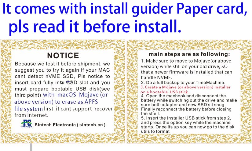 -Notice: The card comes with blak film covering pins ,Sintech install guide paper-card,longer T5 screw and PE PAD,if you didn't get these accessories ,pls report it to us.