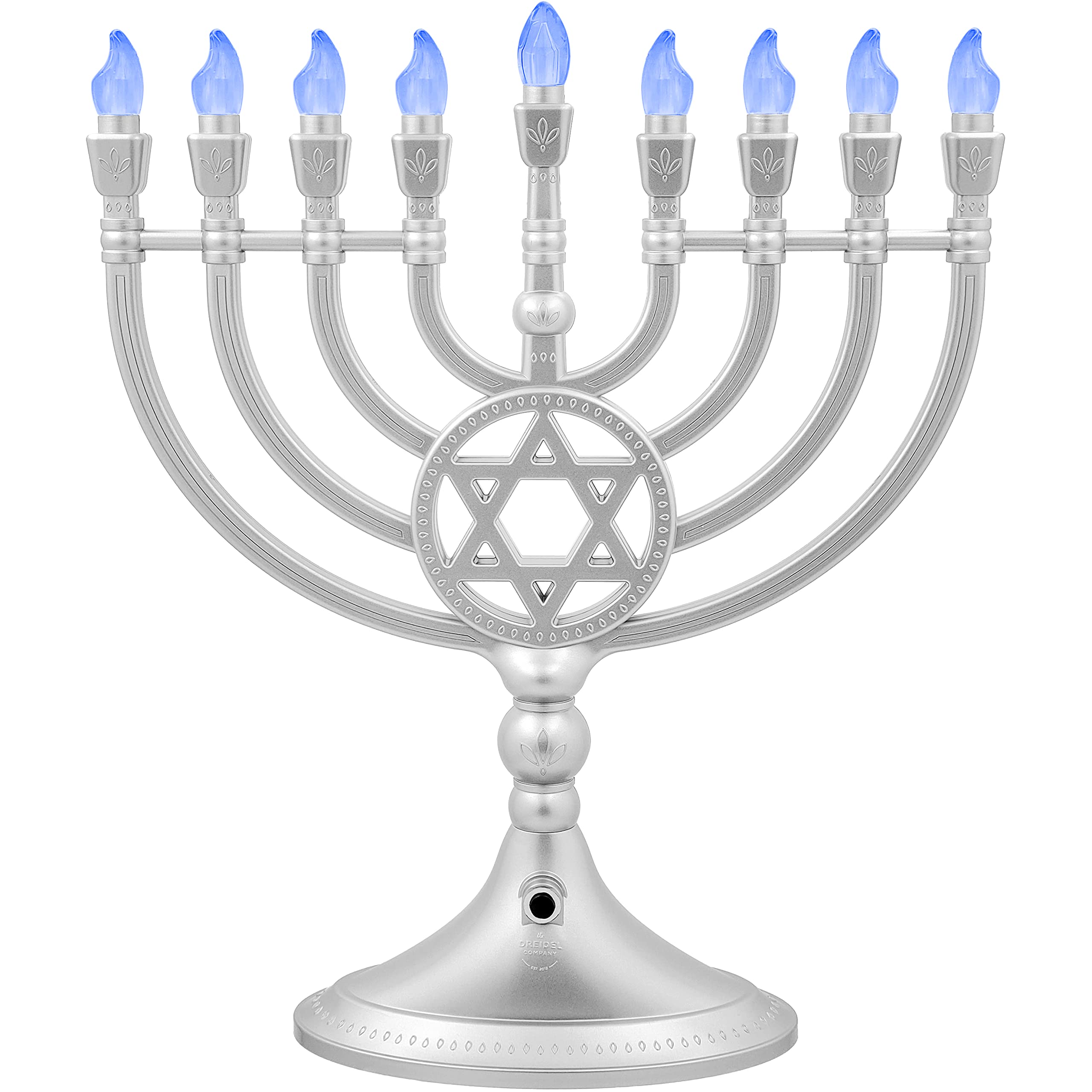 The Dreidel Company Tradicional LED Eléctrico Plata Mate Hanukkah Menorah Tamaño completo 13 pulgadas de alto Batería o alimentación por USB - Incluye un cable de carga micro USB