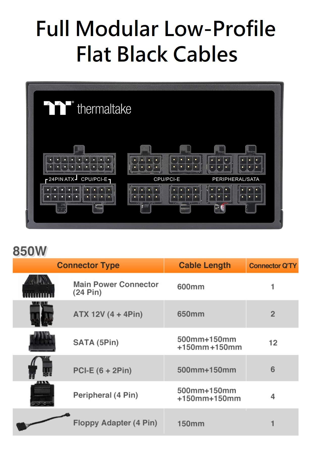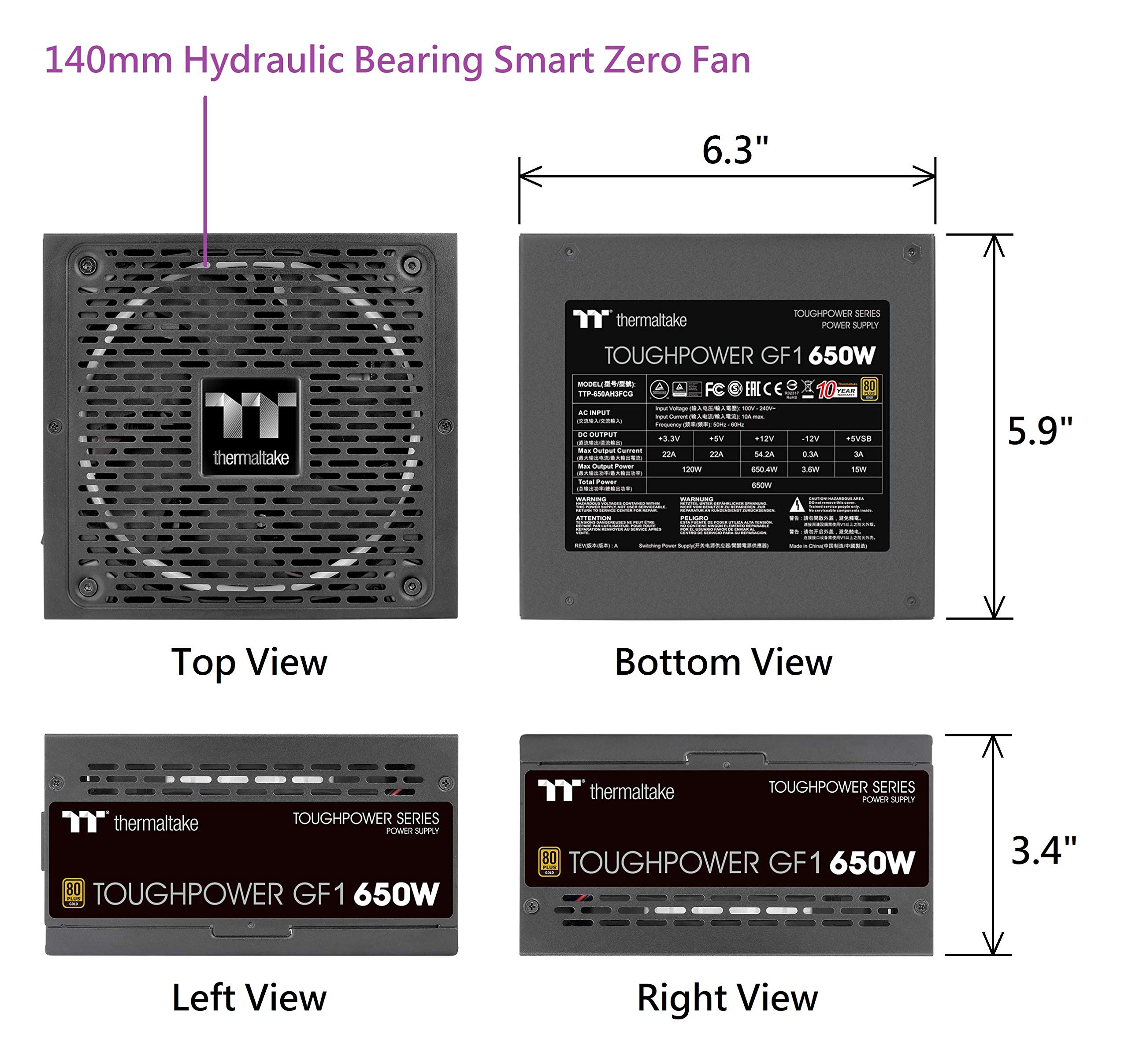 The fully modular Toughpower GF1 series is available in 650W - 850W models and built to deliver 80 PLUS Gold efficiency. The series features a 140mm hydraulic bearing fan, Japanese capacitors and other premium components to help deliver a continuous and stable power with an ambient temperature up to 50°C, while near silent operation and reliable performance are . With an ample 10-year , the Toughpower GF1 is able to satisfy the market, where PC enthusiasts are looking for a premium power supply with all the latest features. "The Thermaltake Toughpower GF1 850W is an excellent product. " - Tom's Hardware "The Thermaltake Toughpower GF1 850W, besides a cool RGB lighting, achieves high performance, and it also sports a fairly quiet operation. " - Tom's Hardware P/N: PS-TPD-0650FNFAGU-1 WATTS: 650W RGB FAN: No MODEL: TTP-650AH3FCG MAX. OUTPUT CAPACITY: 650WPEAK OUTPUT CAPACITY: 780W COLOR: Black DIMENSION ( W / H / D ): 150mm(W) x 86mm(H) x 160mm(D) PFC (POWER FACTOR CORRECTION): Active PFC POWER GOOD SIGNAL: 100-500 msec HOLD UP TIME: > 16msec at 100% of full load INPUT CURRENT: 10A INPUT FREQUENCY RANGE: 50Hz - 60Hz INPUT VOLTAGE: 100V – 240V~ OPERATING TEMPERATURE: 0°C to + 50°C OPERATING HUMIDITY: 20% to 90%, non-condensing STORAGE TEMPERATURE: -20°C to + 70°C STORAGE HUMIDITY: 5% to 95%, non-condensing COOLING SYSTEM: 14cm hydraulic bearing fan EFFICIENCY: Meet 80 PLUS Gold at 115Vac input. MTBF: 120, 000 hrs minimum SAFETY APPROVAL: CE/cTUVus/TÜV SÜD/FCC/BSMI/EAC PCI-E 6+2PIN: 4 PROTECTION: OCP, OVP, UVP, OPP, SCP, OTP.