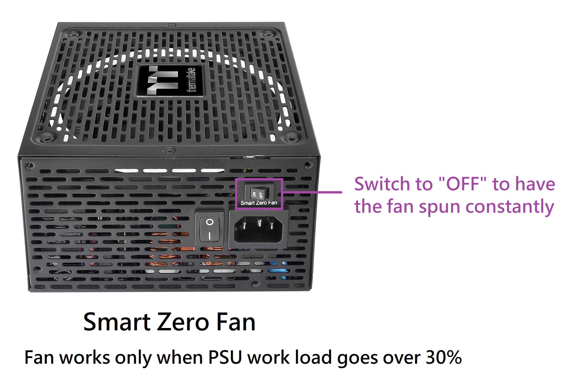 -[Smart zero fan] - Auto-regulated fan speed based on power consumption for a quiet and efficient operation. Fan works only when PSU work load goes over 30%. a switch At the back of the PSU can be turned off to have the fan spun constantly