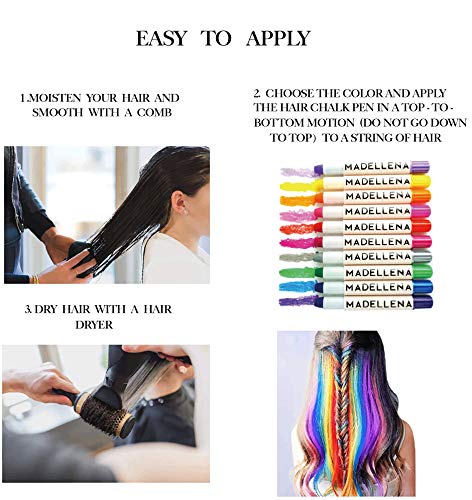-Madellena Hair Chalks are Non-Allergenic, Non-Toxic and Water-Soluble, Environmentally Friendly. Easy to Apply and Easy to Wash Off With Regular Water and Shampoo.