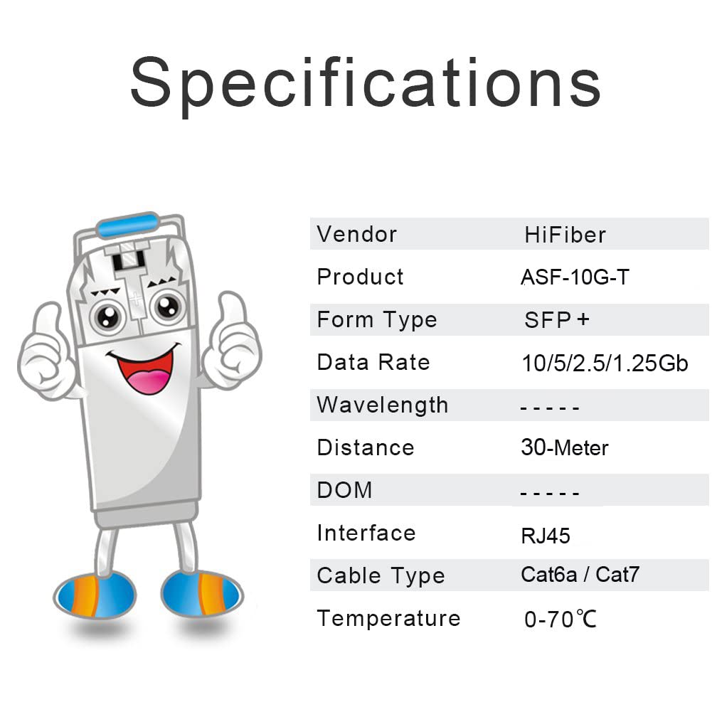 -RJ-45 Connector: 10Gb SFP+ to RJ45 Ethernet Copper Module supports 10 Gigabit over Cat 6a/7/8 cable, up to 30 meters (98ft). It supports 5Gb/2.5Gb/1Gb rate over Cat 5e cable or better,up to 50 meters (164ft)