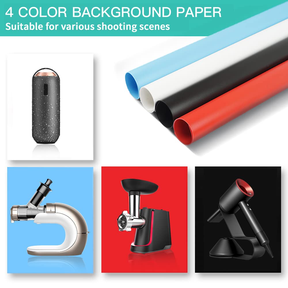 -【Four Color Backdrops】Our professional LED light box comes with 4 backdrops (white/black/red/blue), so you can easily switch background colors to build up various shooting effects. Please note that we have upgraded the light tent, there is no need clip to hold the background, just fix the background paper to the top slot. No matter how you shake it, it won’t fall. Our 60cm/24inch light box has upgraded velcro backdrops.
