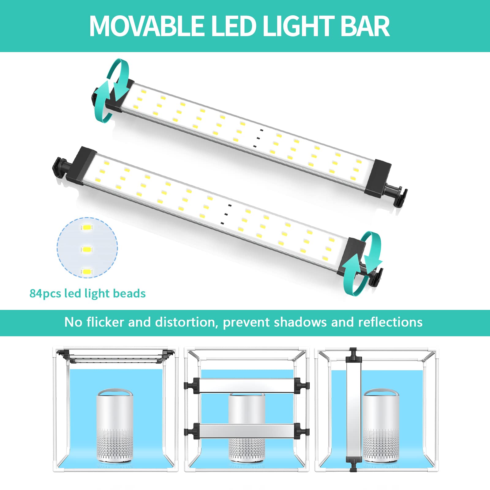 -【Multi-angle Shooting and Easy Installation】 You can open the light box in 4 ways/angles to shoot objects and enjoy varying professional photography angles. The frame of the shooting box is set up with convenient joints. And the tent body is built with zippers. No other tools are needed for the installation and disassembling.