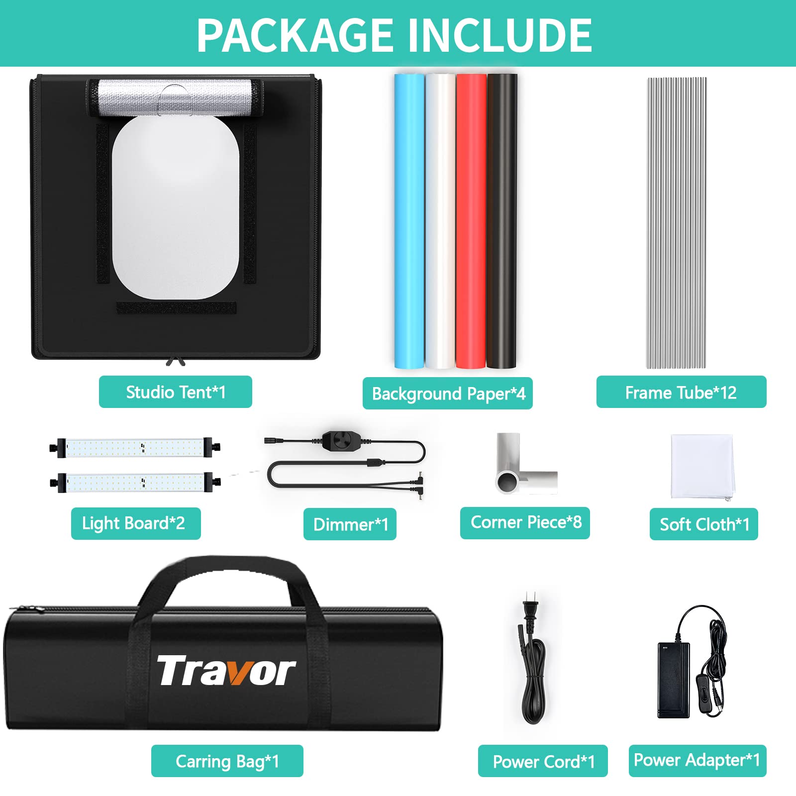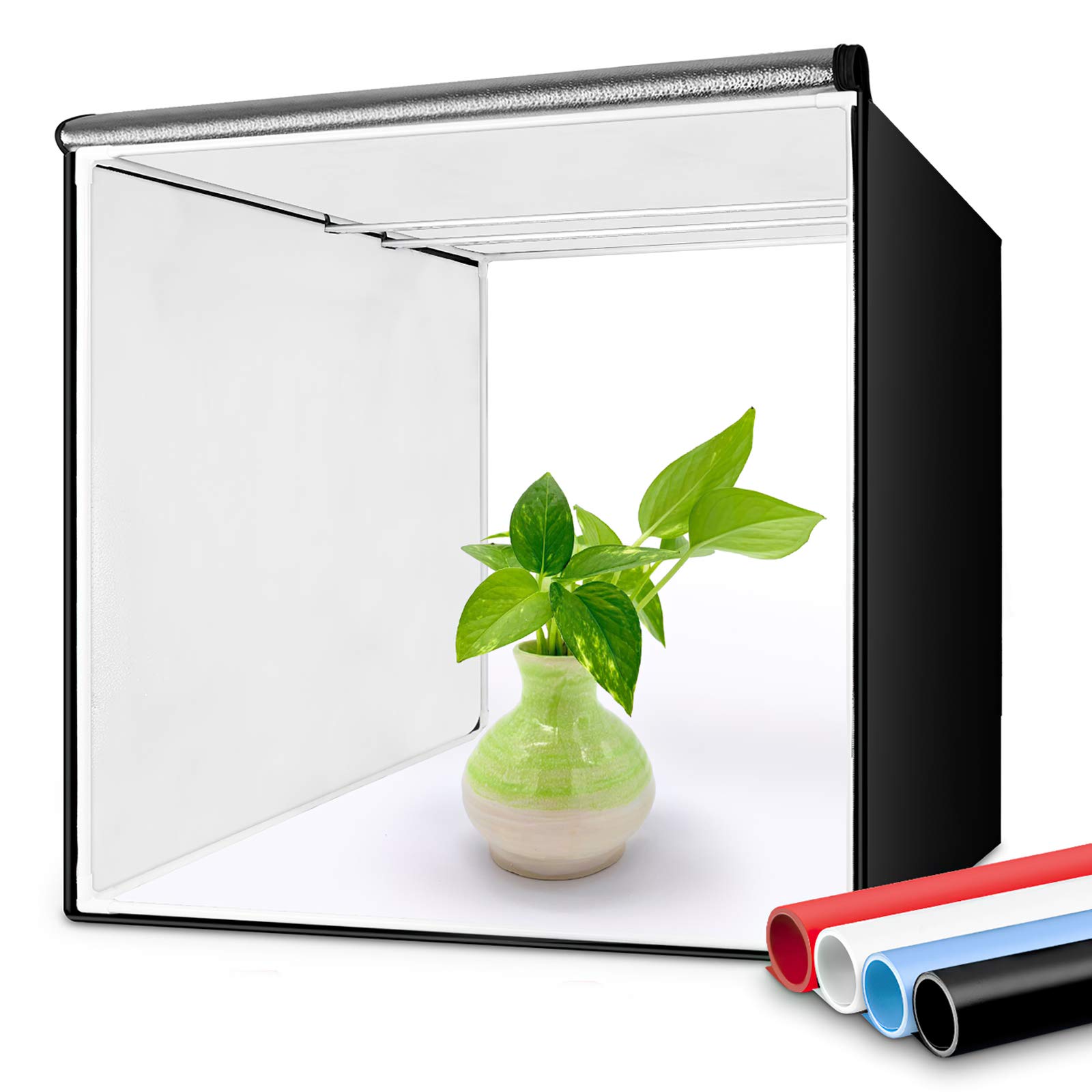 Travor Photo Box Caja de luz para estudio fotográfico de 40 cm, tienda de campaña con luces LED móviles, tienda de campaña con luz de mesa regulable con 4 fondos de color (blanco, negro, rojo y azul), CRI95+