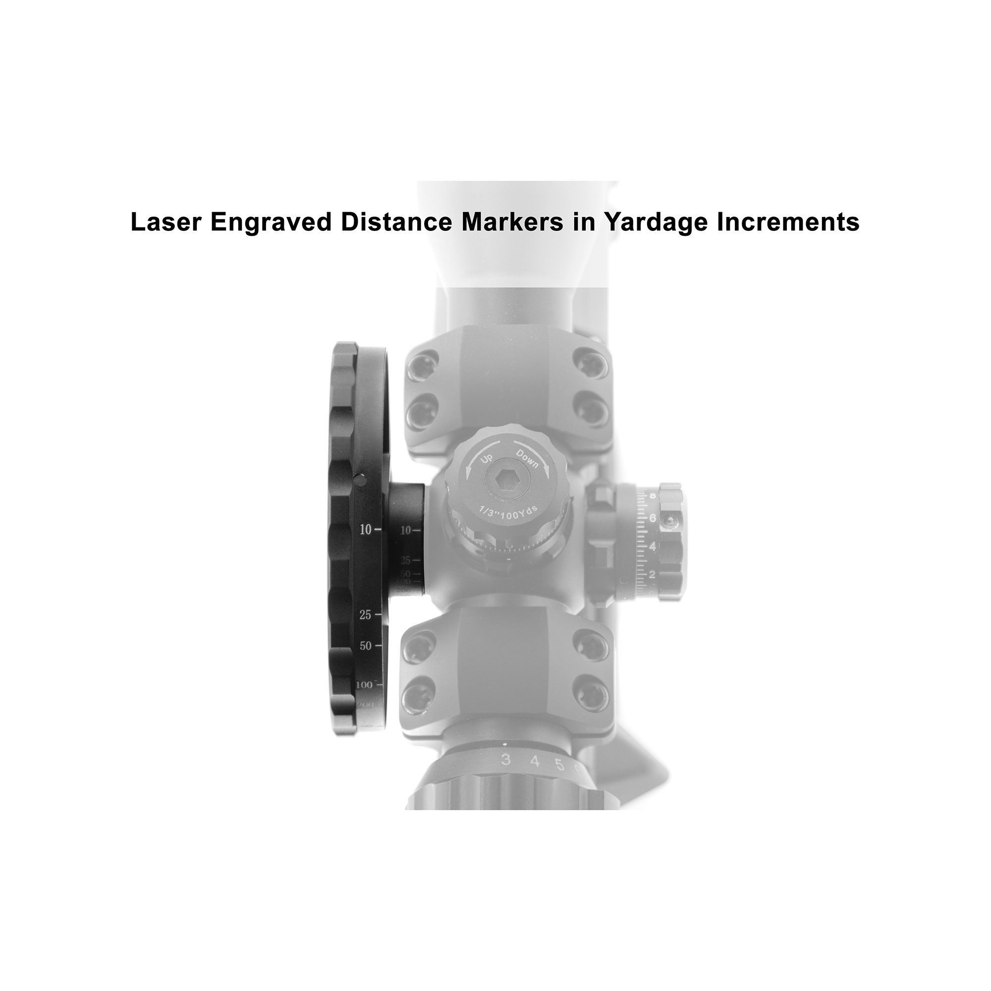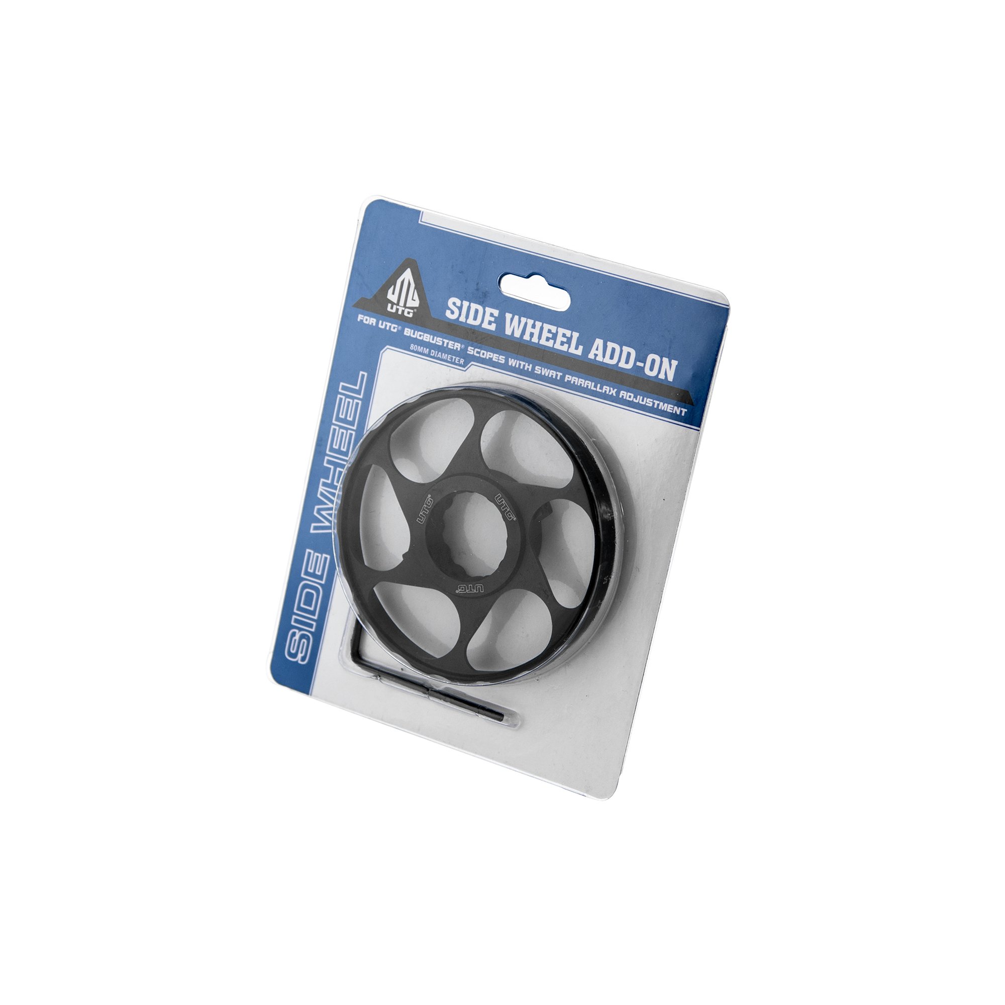 UTG 80mm diameter side wheel add-on for making finer Parallax adjustments, compatible with UTG bug Buster scopes with side wheel adjustable turret (SWAT), matte black anodize Aircraft grade aluminum construction, distance marked with yardage increments.