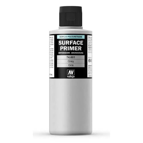 Vallejo - Color imprimador de superficies | Imprimación acrílica gris 200 ml (6,76 fl.oz.) | Acabado Mate y Secado Rápido | Perfecto para aerografía y gran adherencia a figuras y modelos a escala.