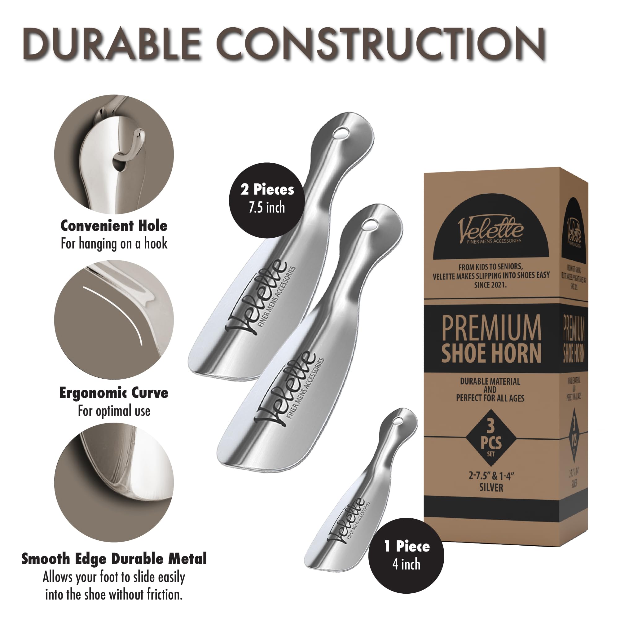 Velette Paquete de 3 calzadores de metal – 2 juegos de calzador de 7.5 pulgadas de largo, 1 juego de calzadores de viaje de 4 pulgadas para niños, hombres y mujeres – ayudante de zapatos, cuchara, calzador de tamaño de viaje para botas, zapatos, zapatilla