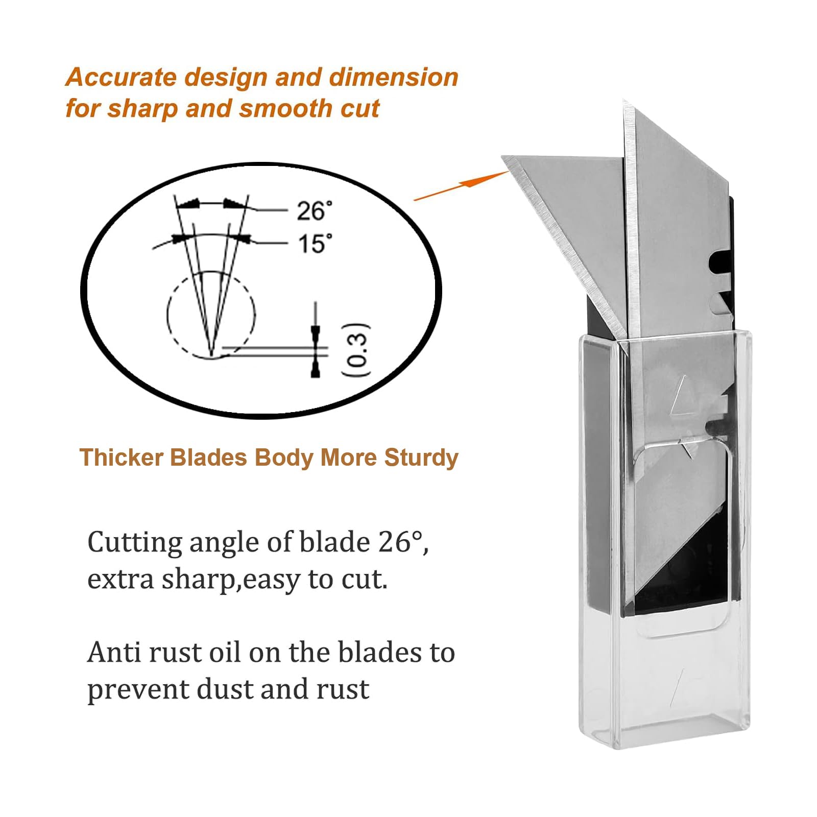 -Each utility knife blade was engineered with a precision-honed edge and 26°cutting angle which make the blade sharp enough to cut.There is a layer of anti rust oil on the blades to prevent dust and rust.