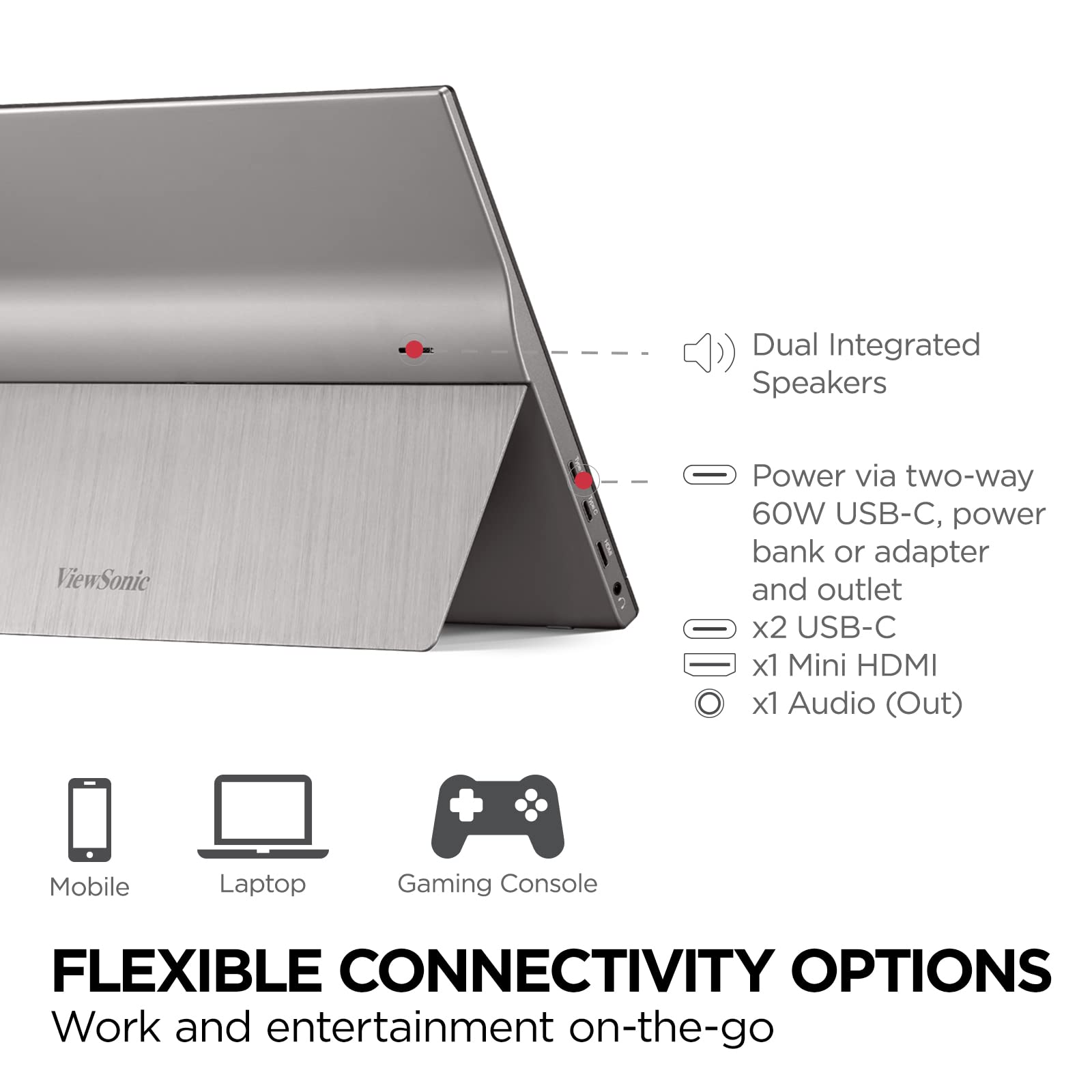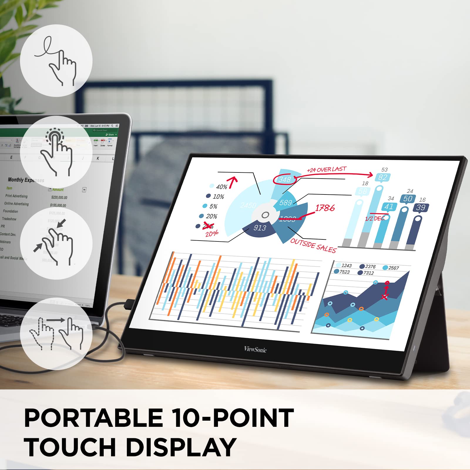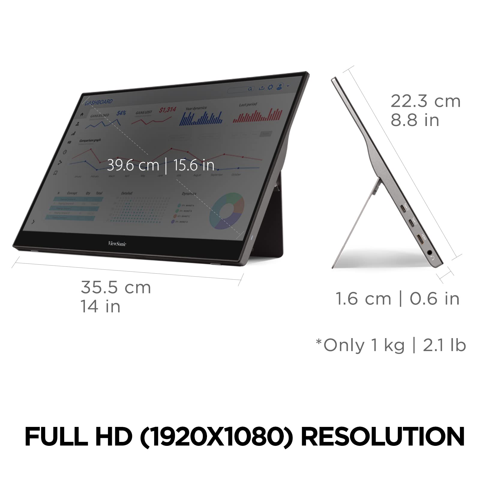 ViewSonic TD1655 15.6 pulgadas 1080p Monitor portátil con pantalla táctil IPS, 20 W USB C de 2 vías, cuidado ocular, altavoces duales, soporte incorporado con cubierta magnética