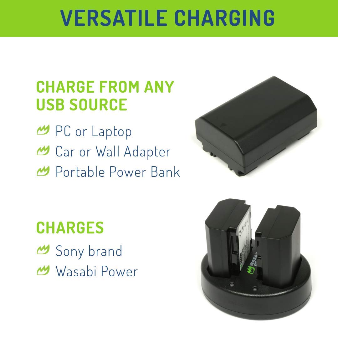 -BATTERY & CHARGER SPECS - Premium Grade-A cells rated at 7.2V, 2000mAh for longer run-time and battery life; Charges two batteries simultaneously from any USB source; Input 5V, 2000mA (recommended); Outputs 600mA (x2); Batteries and charger work with Sony original batteries and Sony original charger
