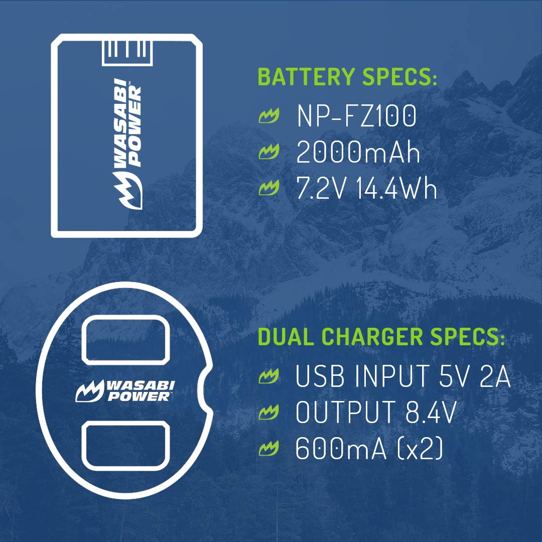 The Wasabi Power KIT-BB-FZ100 includes 2 batteries and one dual USB charger. All items meet or exceed OEM standards and come with a 3-year manufacturer warranty. Need an a7iii battery? Buy a Wasabi Power replacement for the Sony a7iii battery and/or the Sony a7iii battery charger. Battery Replaces: Sony NP-FZ100 Battery Voltage: 7.2V Battery Capacity: 2000mAh for longer battery life (run-time) Battery Cells: Premium Grade A Cells for longer battery lifespan (number of recharge cycles) Battery Compatibility: Works with Sony original camera and Sony charger Charger Replaces: Sony BC-QZ1 Charger Input: USB 5V, 2000mA (max) Charger Output: 8.4V, 600mA (x2) Country of Origin: Assembled in China Warranty: 3-year manufacturer warranty from Wasabi Power Compatible with the following models: Sony Alpha a1 (alpha 1 / ILCE-1/B) Sony Alpha a7 III (alpha 7 III / ILCE-7M3) Sony Alpha a7 IV (alpha 7 IV / ILCE-7M4) Sony Alpha a7C (alpha 7C / ILCE7C/B) Sony Alpha a7R III (alpha 7R III / ILCE-7RM3) Sony Alpha a7R IV (alpha 7R IV / ILCE-7RM4) Sony Alpha a7S III (alpha 7S III / ILCE-7SM3) Sony Alpha a9 (alpha 9 / ILCE-9) Sony Alpha a9 II (alpha 9 II / ILCE-9M2) Sony Alpha a6600 (ILCE-6600 / ILCE-6600M) Sony FX3 Full-Frame Cinema Camera