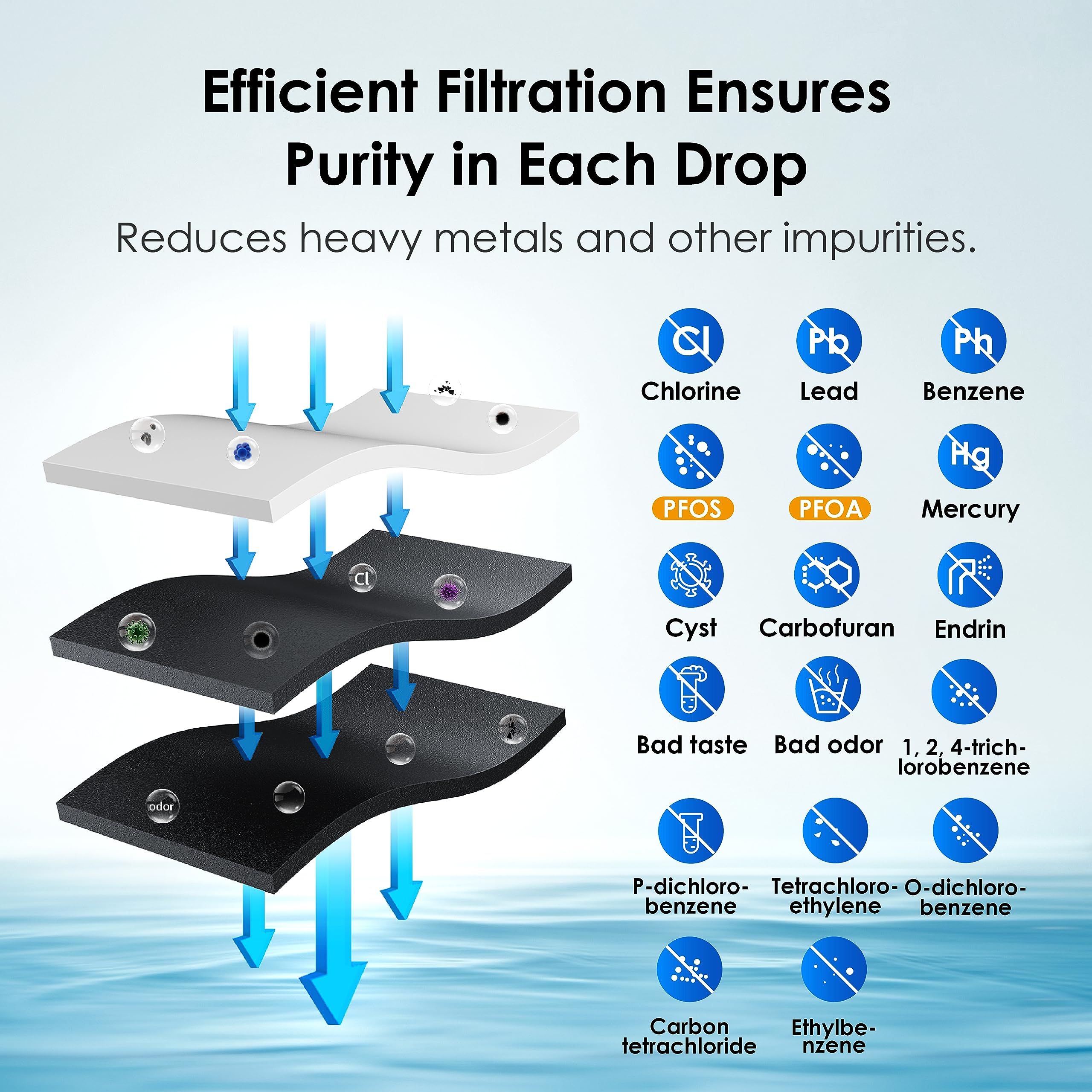 -[Deep Filtration] This filter has been strictly certified against NSF/ANSI 42 for reduction of chlorine, taste and odor and against NSF/ANSI 53 for reduction of over 99.6% of lead, 96.6% of benzene, carbofuran and endrin. Certified by IAPMO, this filter can reduce 11 harmful chemicals like 99.59% of ethylbenzene, 99.99% of o-dichlorobenzene, toxaphene, Atrazine and MTBE to produce clean, pure water. Furthermore, it can reduce 95.3% of PFOA and PFOS tested by the third-party laboratory.