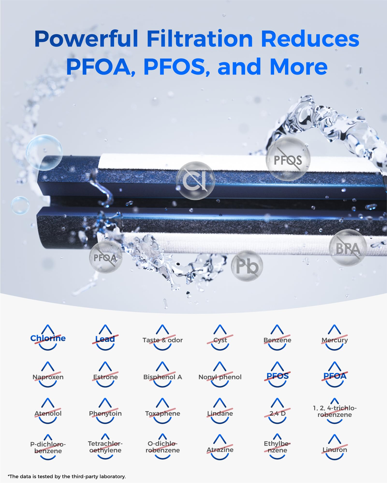 -[Comprehensive Certifications] This filter has been strictly certified against NSF/ANSI 401 for reduction of 99.2% of bisphenol A, phenytoin, estrone, ibuprofen and naproxen and against NSF/ANSI 53 for reduction of 99.6% of lead, 96.6% of benzene and 92.3% of mercury. It is certified by IAPMO for reduction of 20 harmful substances like 99.67% of Particulate Class I, 99.59% of ethylbenzene, over 99% of trimethoprim, 2,4 D, Lindane, MTBE and atrazine. Furthermore, it can reduce PFOA and PFOS according to testing.
