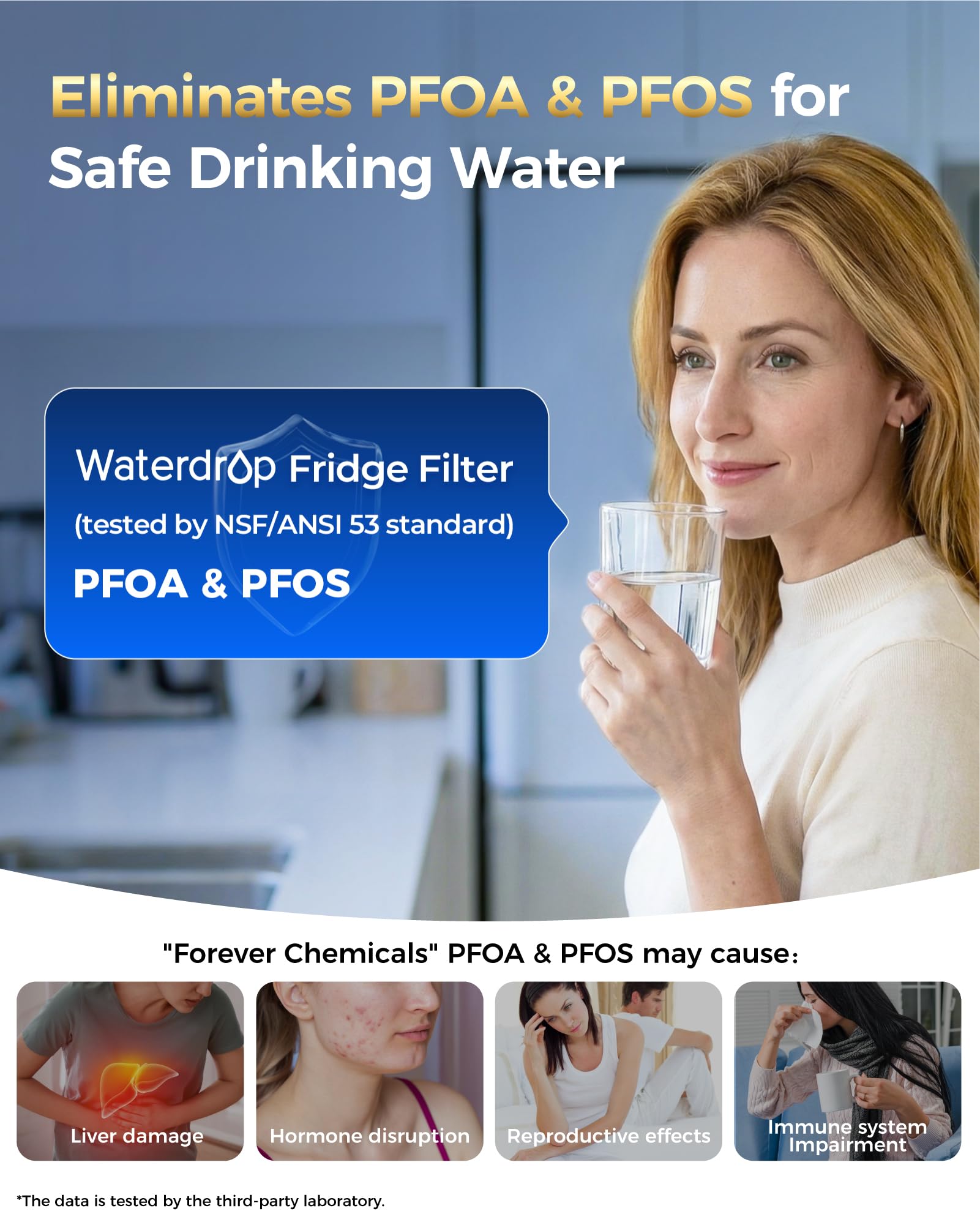 -[Deep filtration] Waterdrop's refrigerator filters significantly reduce the levels of many different harmful substances in your water, including a 95.3% reduction in PFOA and PFOS tested by the third-party laboratory. Moreover, the filter additionally allows through many of the beneficial minerals in water that are essential for health.