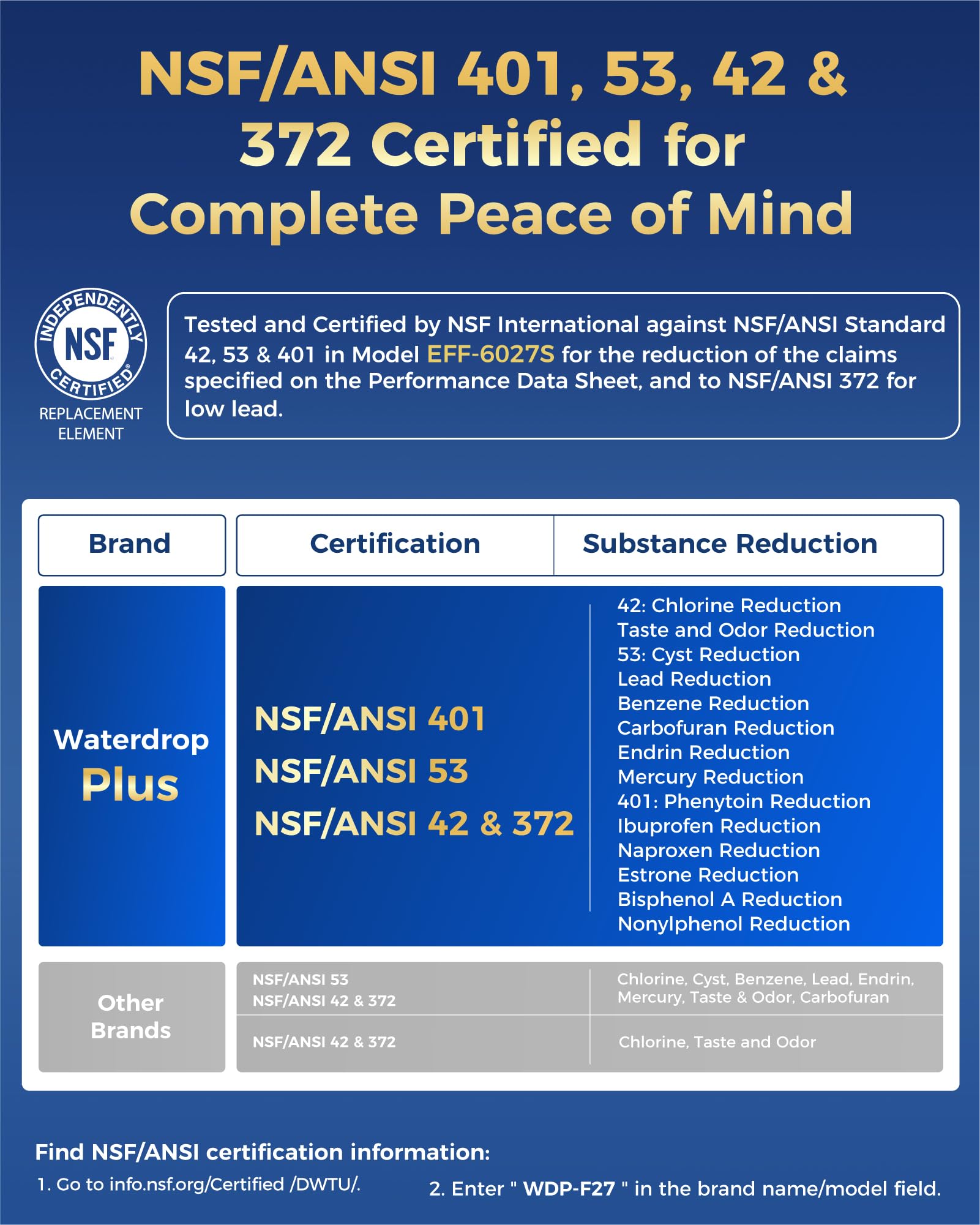 -[Authoritative Certifications] Dedicated to providing pure and healthy drinking water, Waterdrop, a world-famous water purification brand, has been trusted by over 6 million American families. Waterdrop's high-quality replacement filters, from every component to the whole filter, have been certified by NSF and IAPMO against NSF/ANSI 401, 53, 42 and 372 standards for effective reduction of 35 substances, ensuring high-quality drinking water.