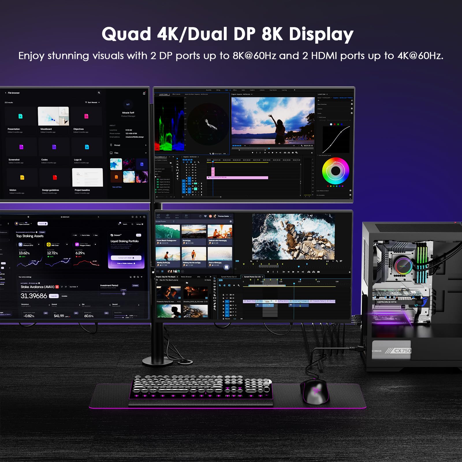 -【Quad 4K/Dual DP 8K】 Experience stunning visuals with 2 DisplayPort and 2 HDMI ports, each supporting up to 8K@60Hz/4K@144Hz(DP 1 with DSC), 8K@60Hz/4K@120Hz(DP 2), 4K@60Hz(HDMI 1/2) resolution. Supports mirror and extend modes, enhancing productivity in work or entertainment. Get seamless performance from this high-end computer Monitor cards solution