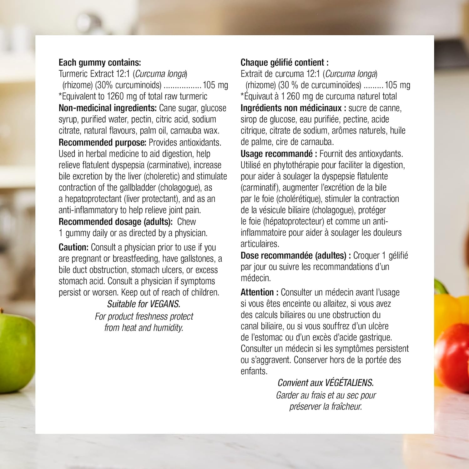 Convenient gummy form of turmeric curcumin – no need to swallow pills A one-per-day formula Each gummy provides 105 mg of turmeric extract standardized to 30% curcuminoids