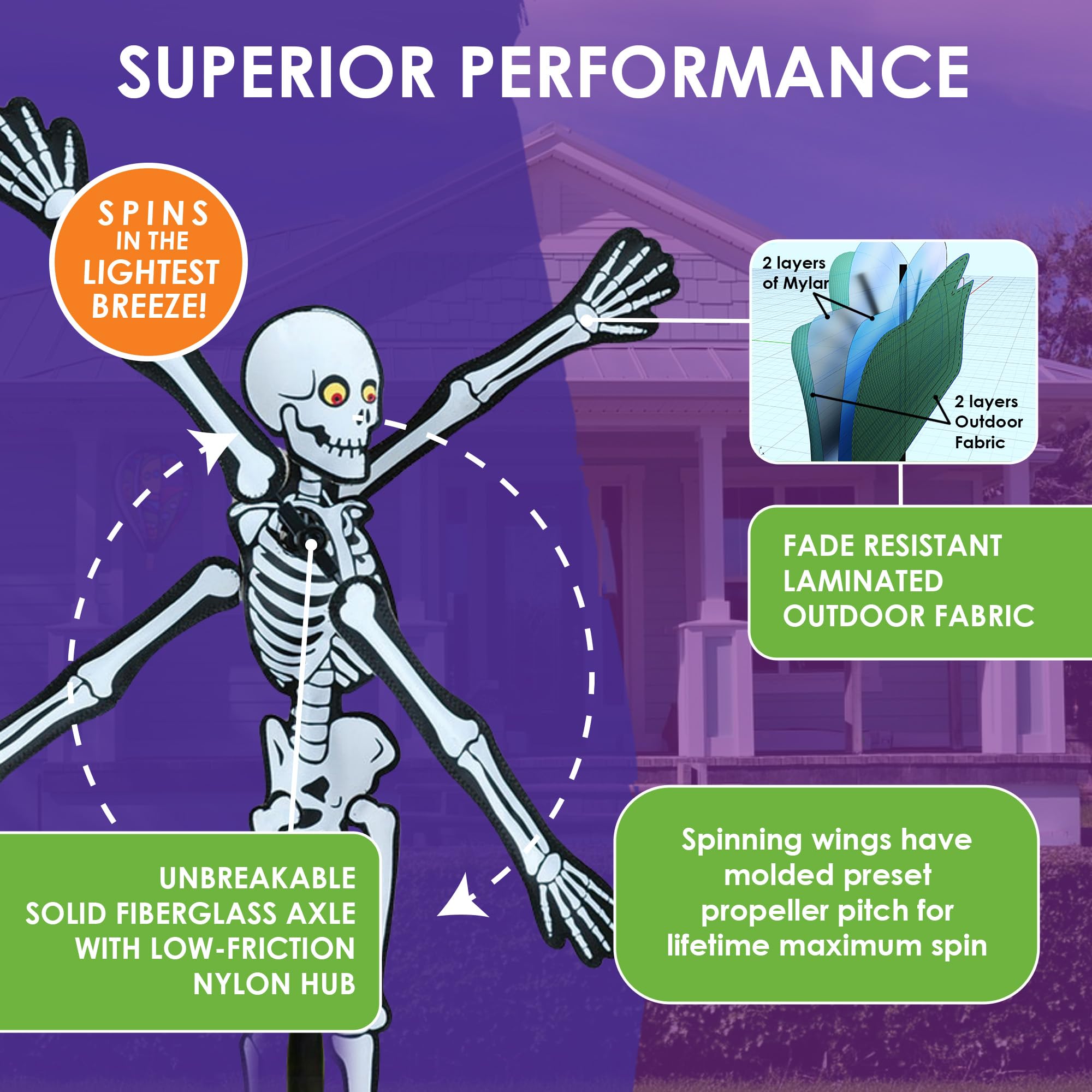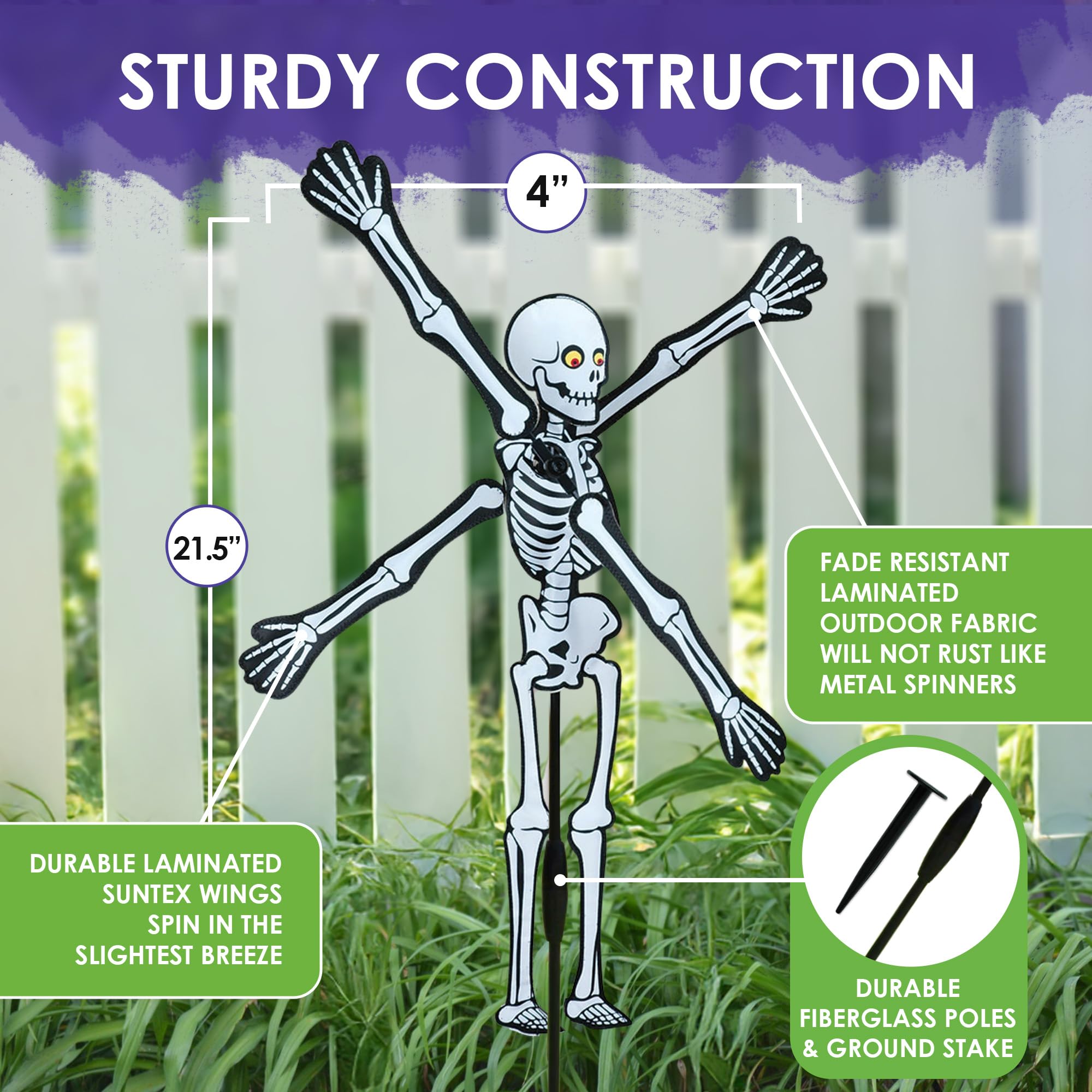 -VIBRANT COLORFUL DESIGN – A spooky skeleton motif with bold patterns & eerie details, this spinner adds festive Halloween flair to patios or gardens. Perfect for the season, it brings lively motion & a playful spooky touch to any outdoor space.