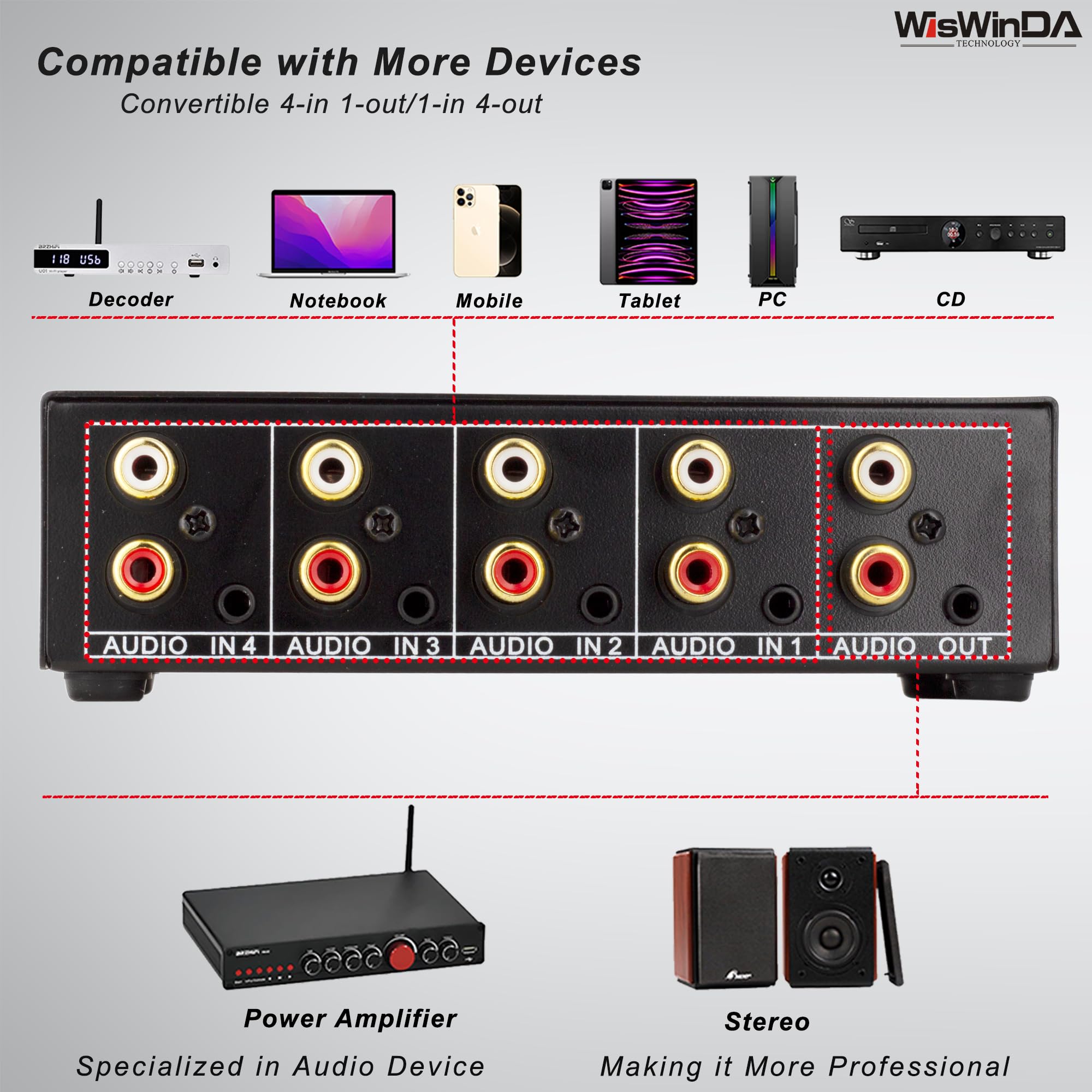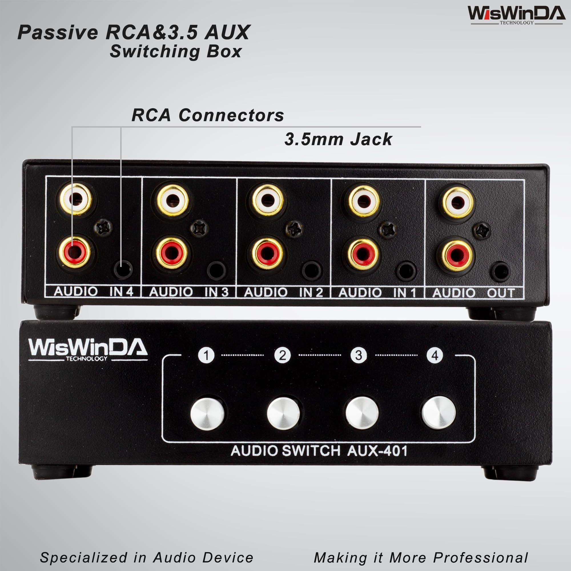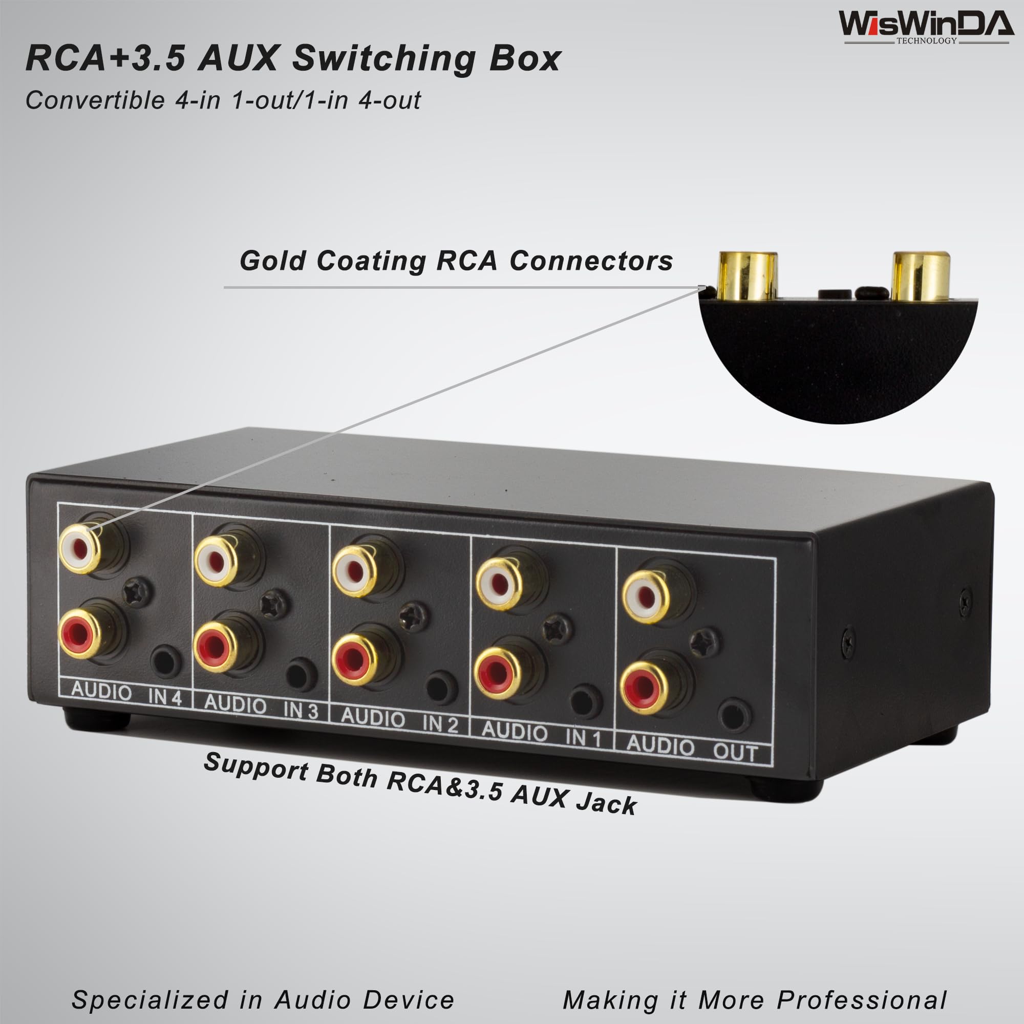 WisWinDa 4 entradas 1 salida RCA 0.138 in AuxAudio Switch Box Convertidor de audio 4 canales 1 entrada 4 salidas Selector de audio pasivo Caja de conmutación Conectores RCA de calidad (RCA+AUX 4IN-1OUT/1IN-4OUT), Negro, WDRCAUX-0401