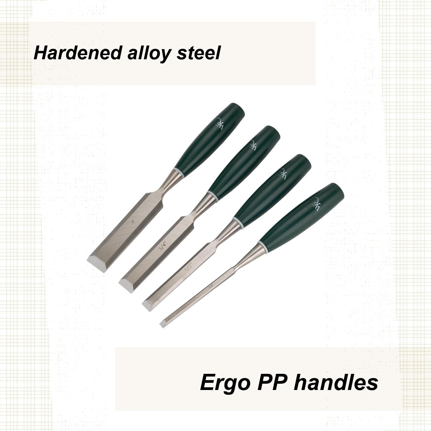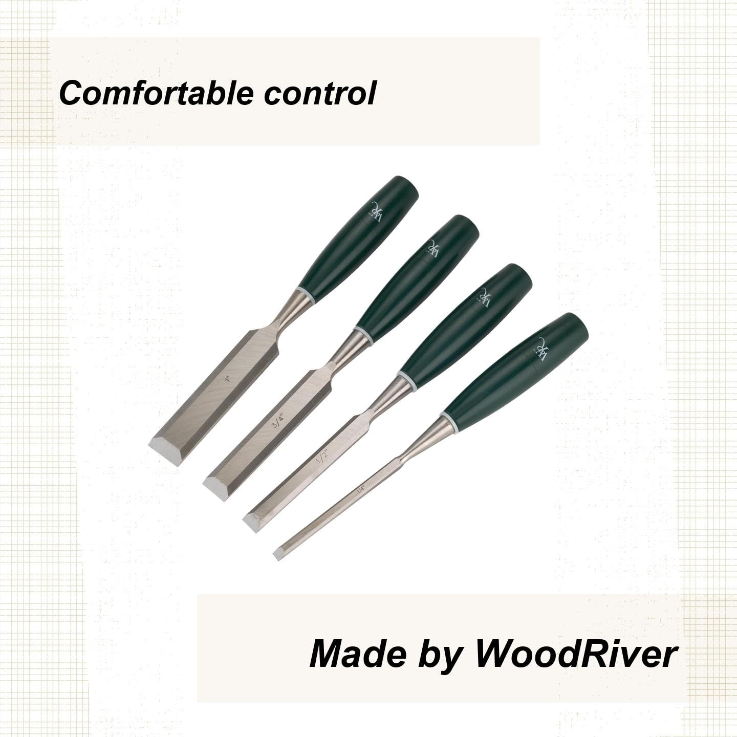 Set of four includes 1/4", 1/2", 3/4" & 1".The bevel-edged WoodRiver Chisels are designed to meet the needs of today’s woodworker. These economically priced chisels feature handles that are contoured for ergonomic comfort and superior control. Constructed of 115CRV3 tool steel, the edges are heat treated to a hardness of 59-63 RC for exceptional sharpness and edge retention. Chisel handles are made of an impact resistant polypropylene to withstand heavy mallet blows. Overall lengths are 9-3/4"; blade lengths are 3-3/4". These tools are factory ground and require honing before use. Set includes 1/4", 1/2", 3/4" and 1" wide chisels. About Us: Founded in Boston in 1928, Woodcraft's operations were moved to Parkersburg, West Virginia in 1989. It's been over 90 years since Woodcraft first began selling high quality woodworking tools and supplies out of a one room shop in Boston's North End, and Woodcraft is still firmly committed to providing woodworkers with superior products and expert advice. We are America’s leading supplier of saws, hand planes, power tools, hand tools, wood stain and finishes, routers, sanding supplies, wood, wood turning project kits, dust collection, and wood carving tools. We also offer a wide selection of woodworking plans, books and videos. Our family of brands includes WoodRiver, Highpoint, Woodcraft, Pinnacle and Woodcraft Magazine.