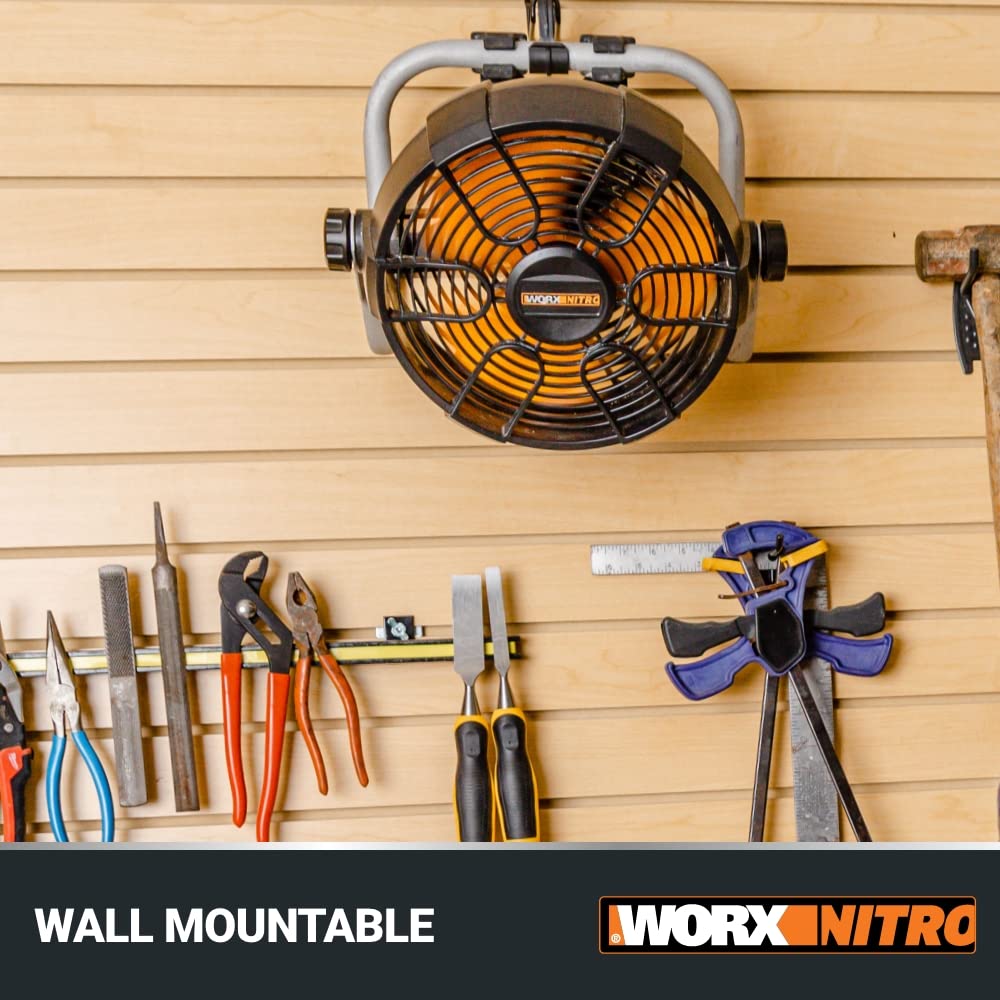 Every workspace needs a fan. Get one that you can take from job to job, or move around the workshop. The Worx Nitro 20V Power Share Cordless Work Fan with Ready Charge is perfectly designed to meet that requirement. Small and lightweight enough to be portable, powerful enough to cool down or ventilate a room. Use it anywhere on battery power for up to 6 hours on Low speed, or 2 hours on High, with a standard 2.0Ah battery. Or take advantage of its Ready Charge functionality and plug it in and charge the battery while the fan is still in use. Low speed operates at 0-1500 RPM/310 CFM, High at 2500 RPM/450CFM. To put it in perspective, that’s as much high-volume air output as a heavy-duty leaf blower. Yet this fan’s blade diameter is only 9 in, and it weighs just 5 lbs., so it’s easy to transport and store. The head rotates 360 degrees so you can blow or ventilate in whichever direction you need to. The convenient hanging hook means you can place it up high and hang it from a shelf, beam, pipe, or pretty much anything. It also has mount holes on the back so you can install it on the wall for a more permanent placement. This cordless work fan is part of the Worx Nitro Series of battery-powered tools, engineered to deliver more performance and run time than other battery-operated tools on the market.