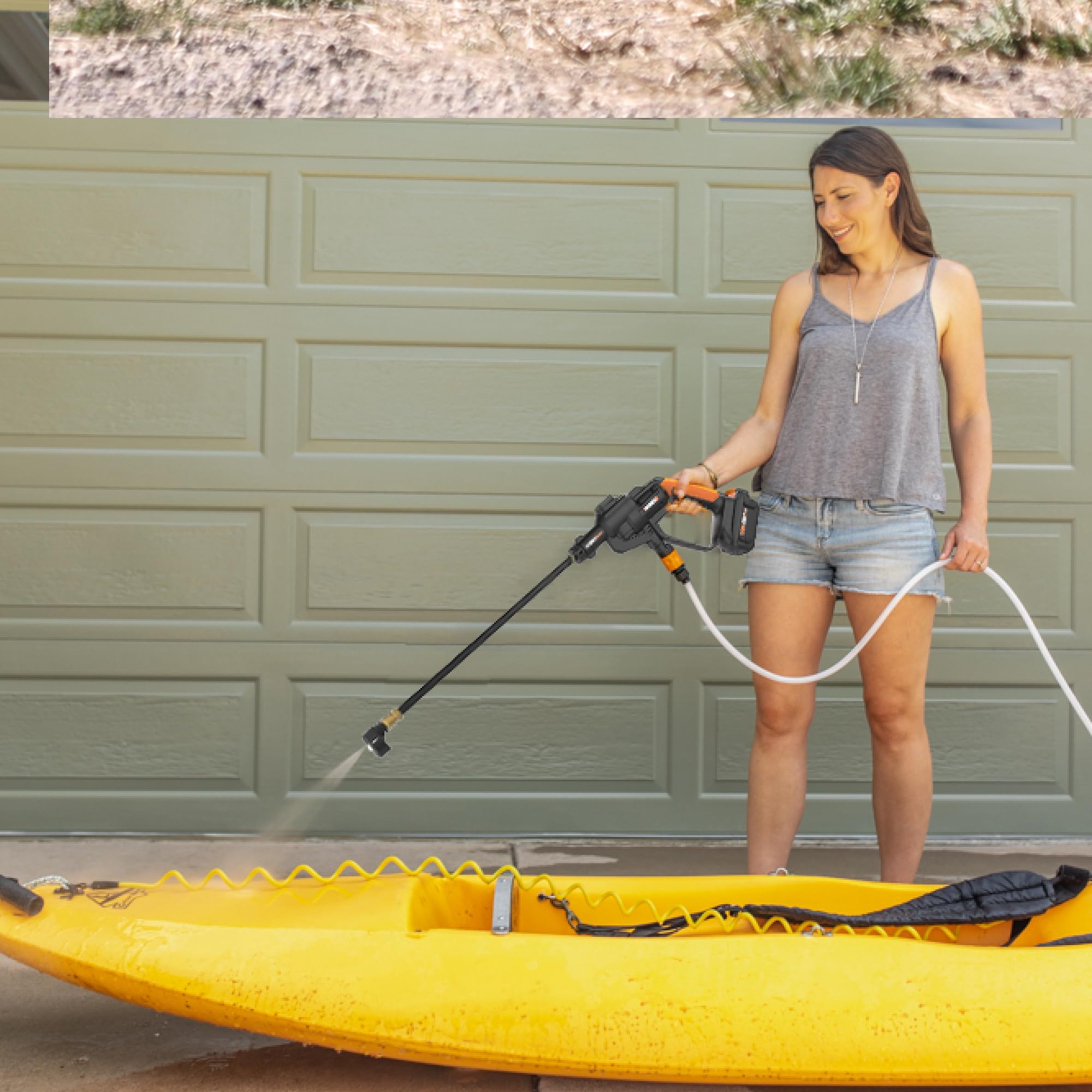 This is the perfect Hydroshot if you already have Power Share tools and batteries. This Hydroshot is less expensive because it doesn’t come with a battery or charger. The best part about the Worx Power Share platform is that you save money on batteries because you don’t have to buy one with every tool, you can share between them. If you’re cleaning near a pool, lake, marina, or have a bucket, the included 20-foot draw hose will pull water from there. And the 5-in-1 Long Cleaning Lance lets you select from 5 different stream strengths: 0, 15, 25, 40, and watering—and its long neck lets you get into hard to reach places. The simple 1-setting water pressure feature means there’s one less dial to mess with, so all you have to do is point and clean. As a matter of fact, pretty much anyone can use this Hydroshot because it only weighs 3.7 lbs. And the handle and trigger are designed to be comfortable and easy to squeeze. So get yourself a Hydroshot and go have some fun cleaning the porch, deck, boat, your truck, the windows, siding, patio furniture, the garage, the driveway