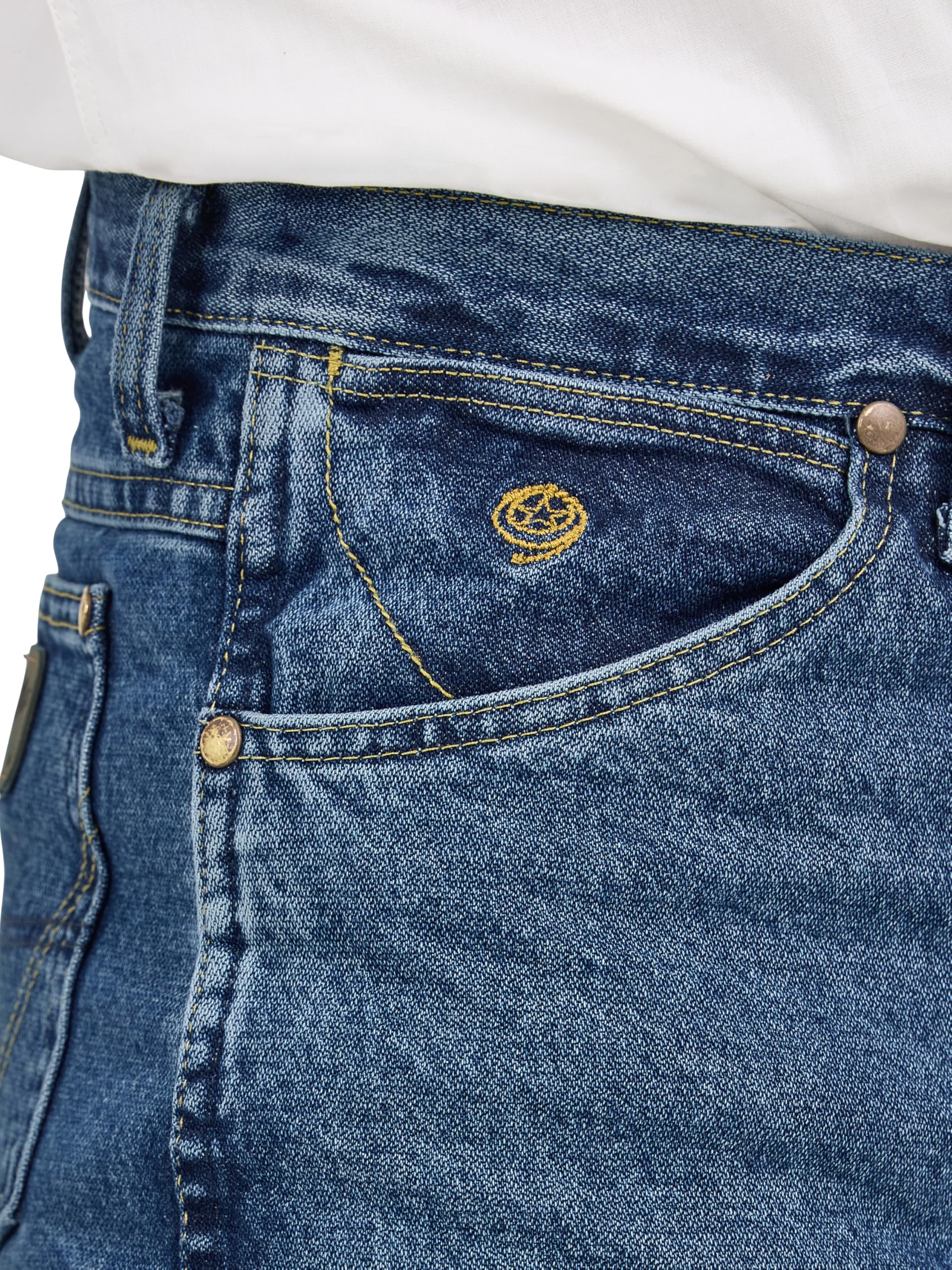 -FIVE POCKET STYLING. This cowboy cut jean is constructed with an authentic five pocket styling: (1) watch pocket, (2) front scoop pockets, (3) back patch pockets. Finished with copper rivets for added long-lasting durability.