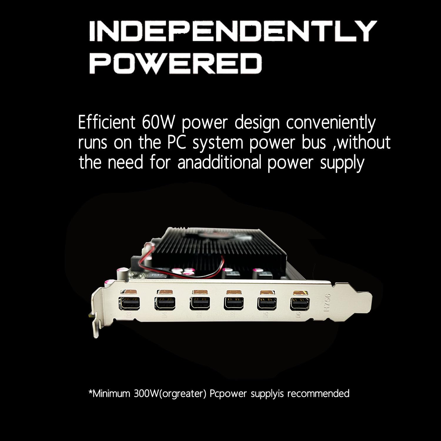 -PCIe Bus Powered: This multiple monitors card draws power through its PCI-Express 3.0 X16 interface, not require any additional power connector, max power consumption at 60 Watts when full lodaed.