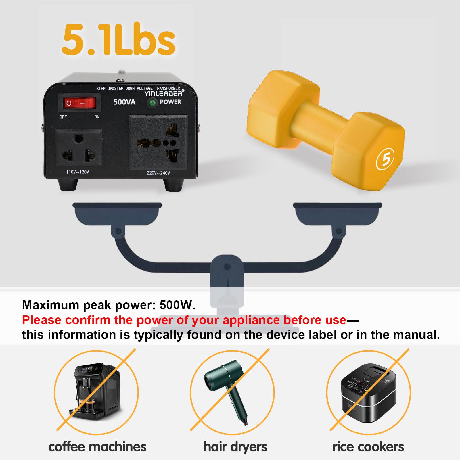 -【Warning】The 500W transformer cannot support high-wattage appliances (e.g., coffee makers, hair dryers, rice cookers, microwaves, AC units, or curling irons). For these devices, use our 3000W transformer.【This is NOT an isolation transformer.】